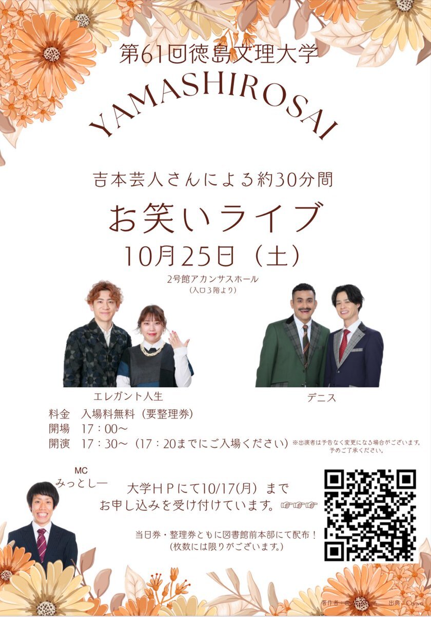 【お知らせ】 徳島文理大学 第61回 山城祭にて、「お笑いライブ」が決定しました! ゲストは #デニス さん #エレガント人生 さん、MCは徳島県住みます芸人 #みっとしー さんです! 大変貴重な機会をお見逃しなく! pic.x.com/Vg9E8PJmOP