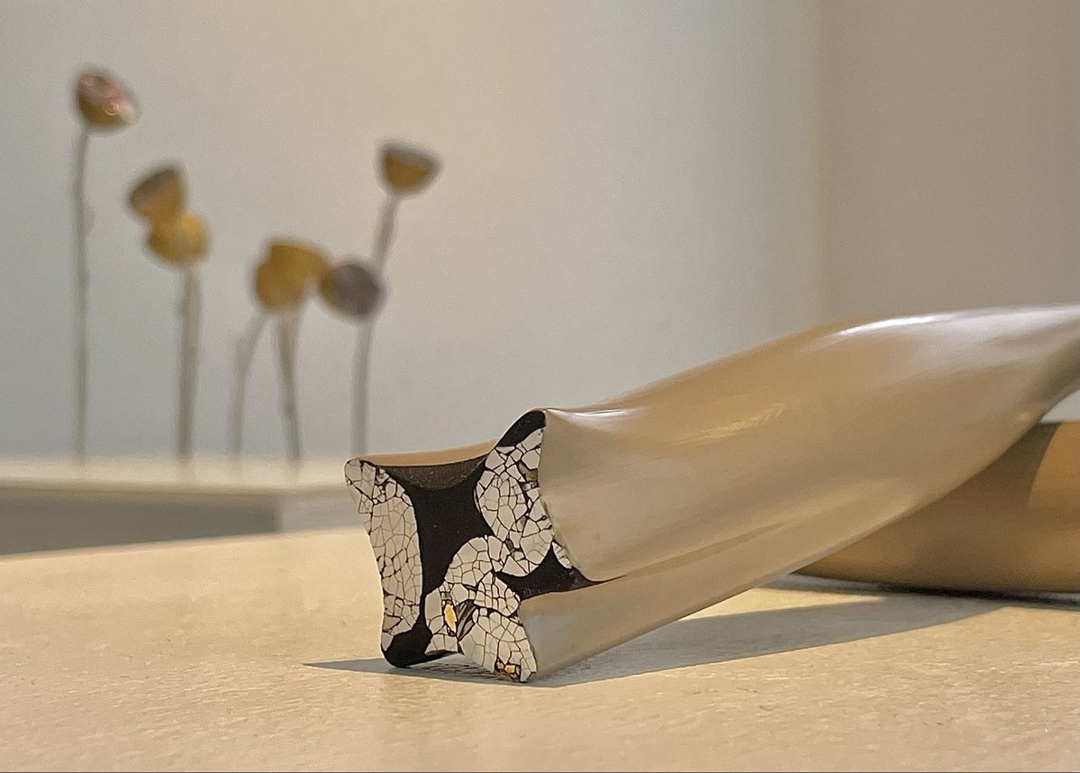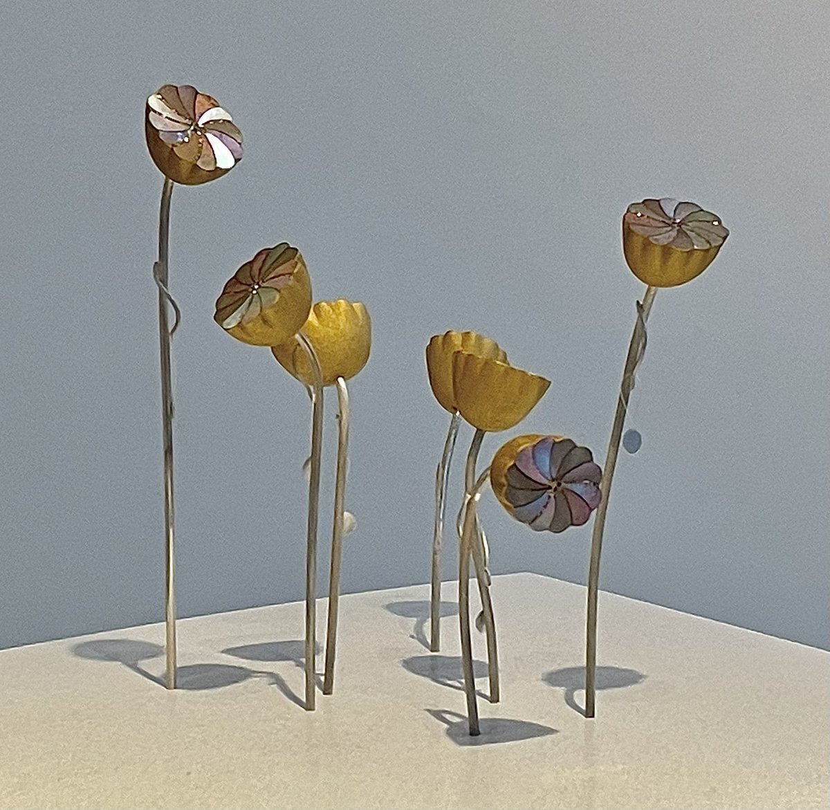 山岸紗綾 花をめぐる9つの話@ April Shop。螺鈿、卵殻、蒔絵などの加飾技法で彩られた花。螺鈿が施された花は光の反射や角度によって表情を変え虹色の輝きを放つ。目を凝らすと花弁と花弁の間に微かに金が煌いて美しい。伝統的な技法と独創的な表現がとけ合う新しい漆芸の世界。 pic.x.com/xO8zagT4EW