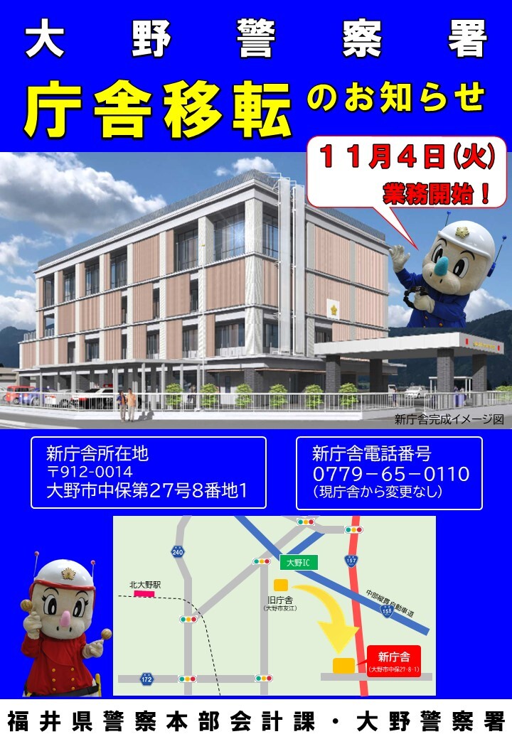 【新庁舎で業務開始】 今日から新庁舎での業務を開始! 安全・安心に暮らせる『結の故郷・越前おおの』の実現に向け、署員一同、心機一転、最善の努力を尽くしてまいります👮 #大野警察署 pic.x.com/dsRLFHvuVM