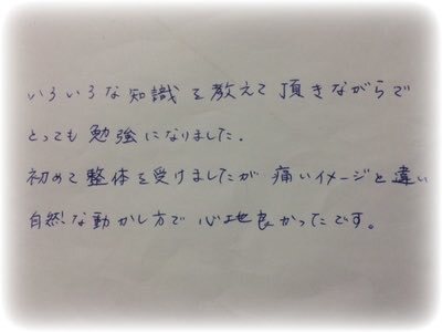 お客さまの声。今回は40代主婦の方からです。 いろいろな知識を教えていただきながらでとっても勉強になりました。初めて整体を受けましたが、痛いイメージと違い自然な動かし方で心地良かったです。 手紙でもらうと嬉しいですね。ありがとうございました!次はあなたの番ですよ。 #都留市 #整体 pic.x.com/1SNuPE453K