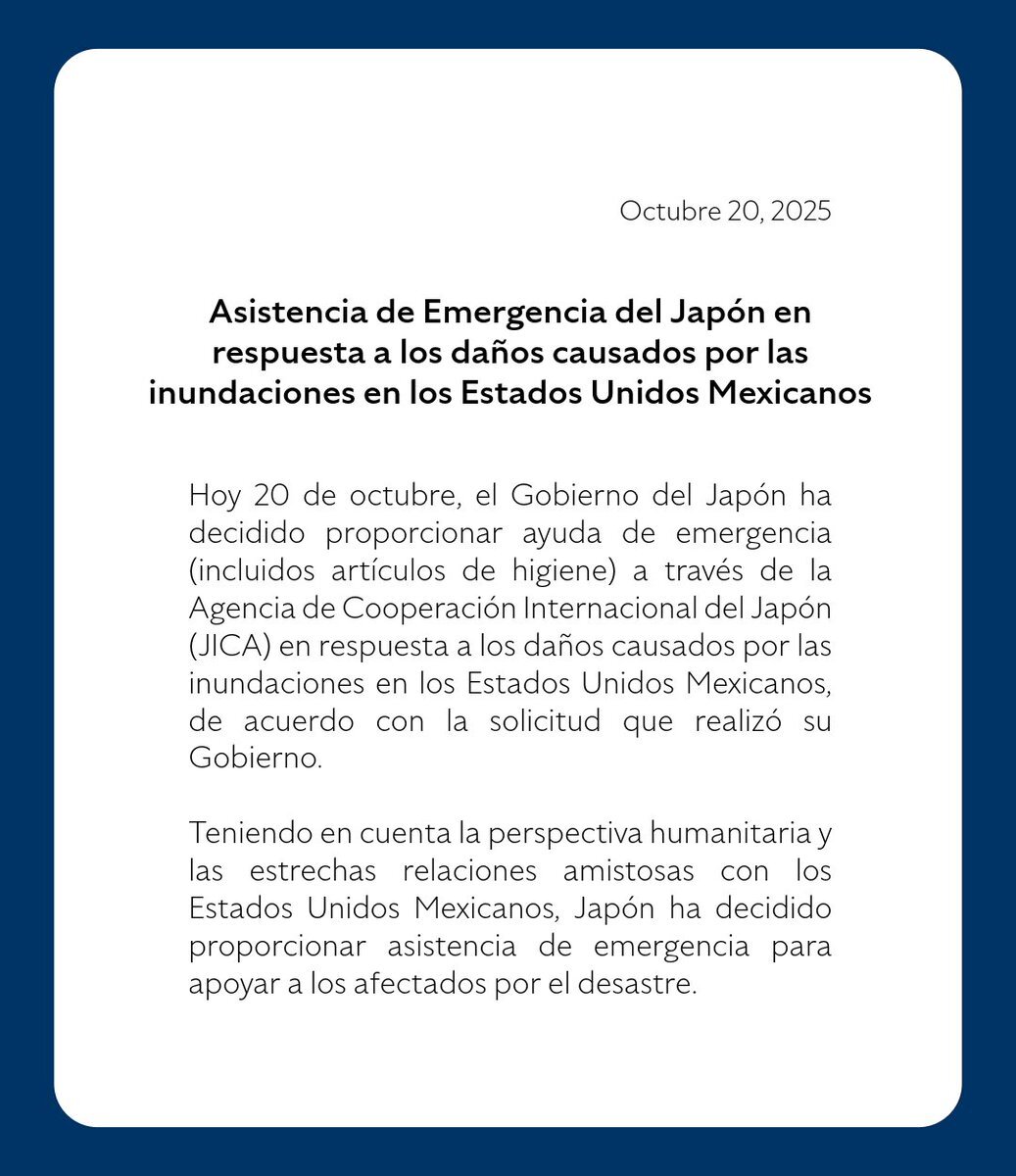 El día de hoy el Gobierno del Japón ha decidido el envío de ayuda de emergencia a México, en apoyo a las víctimas de las inundaciones que afectaron 5 estados del país. Espero que las personas encuentren pronto alivio y se recuperen. México y Japón, amigos en la adversidad.