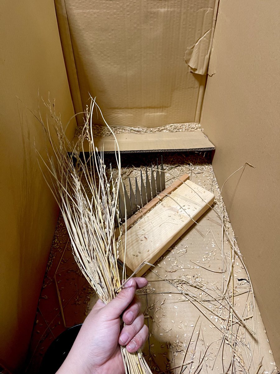【脱穀完了】自作千歯こぎで6.5kgのお米を取り出せた。収量は260kg/反で慣行農法の550kgには届かないけど有機農法でこの量は割と良い方かと。熟す前に台風で倒れたからそれがなかったらもっと行ってた。 #アナグラ米 #稲作 #屋根栽培 pic.x.com/FqTTd10ylv