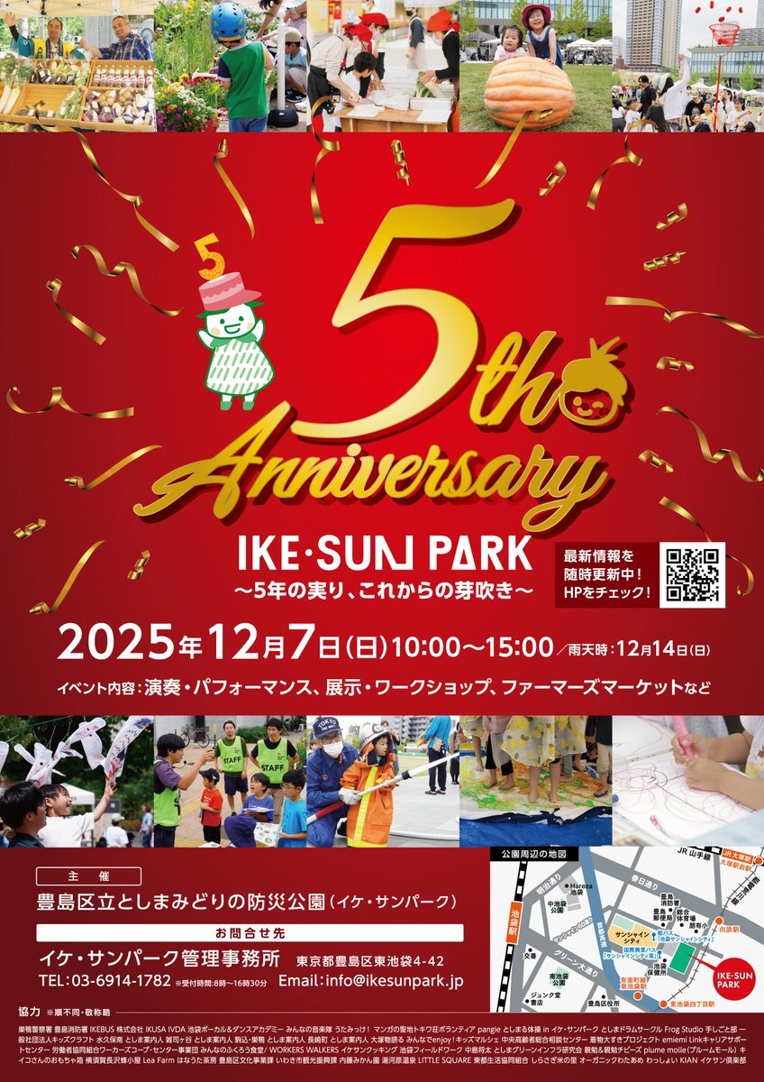 \#イケサンパーク5周年 / 情報解禁! 開催日:2025年12月7日(日)10~15時 今年は約180名の地域の皆様と、みんなで作る5周年祭を開催する運びとなりました。地域の防災と憩いの公園として、訪れた人たちの心に残るあたたかな時間となりますように。皆様と盛大にお祝いできる日となれば幸いです☺✨
