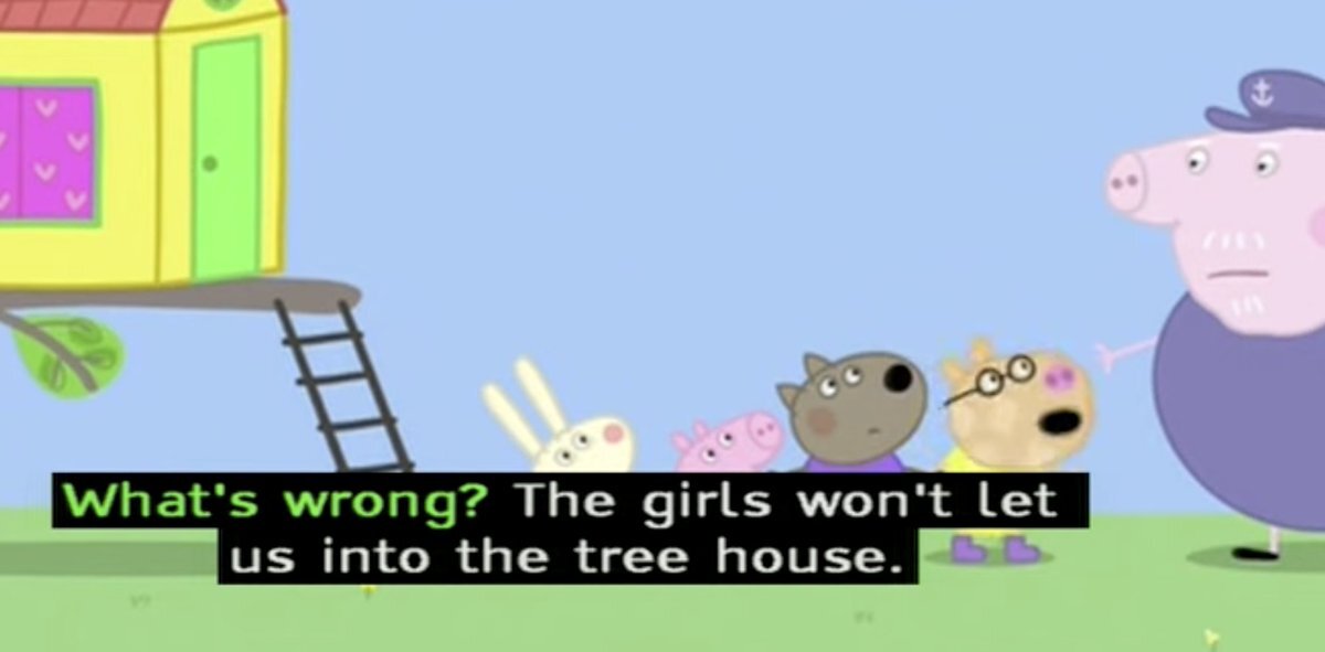 3⃣ What’s wrong? 「どうしたの?」 The girls won’t let us into the tree house. 「女の子が、僕たちを木の家に入れてくれないんだ。」 let [someone/something]+方向を表す副詞 …を….へ移すのを許す。 pic.x.com/6S6Strq6le