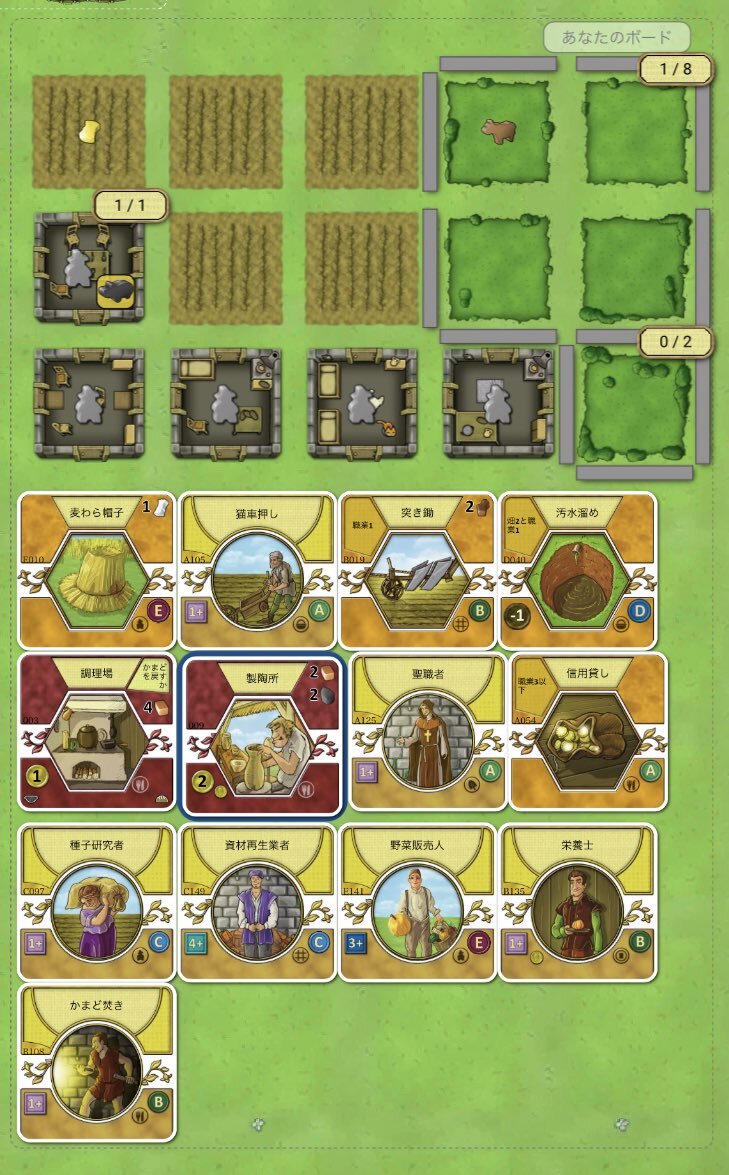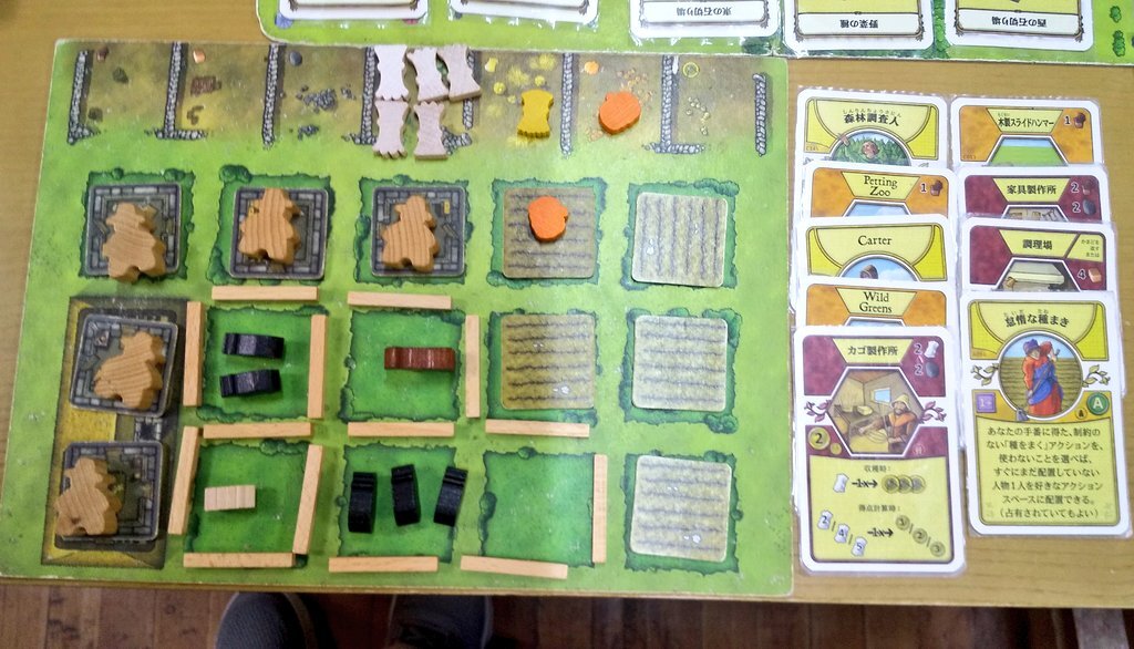 アグリコラ1回目は3人で。2番手49点2位。荷馬車の運転手で13飯稼いだのがハイライト。木の家5軒→スラハンで石の家改築の流れ。でも飯がきつくて後半伸びず。 2回目は4人で。4番手53点2位。早期に石の家改築→鋤職人で畑。盤面は充実したけど、大進歩を集めた上家に負けました。 #はまりばカフェ pic.x.com/FJdnzDvrpz