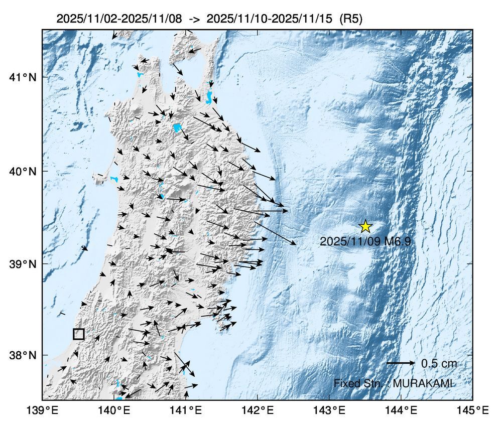 電子基準点日々の座標値速報解、9日のM6.9の前7日間、後6日間それぞれの平均の差で作った地震時の変動。以前のポストでは固定点を本庄としたがここもわずかに動いているようで、この図では村上(四角)にした。変動が1cm以下と小さいので、固定点の選び方で全体の印象がかなり変わる。 pic.x.com/kjkNhmAzuf