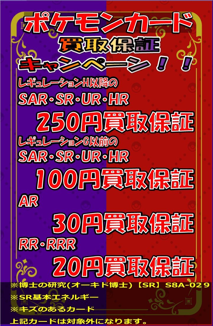 🔥🔥買取保証キャンペーン🔥🔥 レギュレーションH以降のSAR・SR・UR・HR 💴250円買取保証💴 レギュレーションG以前のSAR・SR・UR・HR 💷100円買取保証💷 AR 💰30円買取保証💰 RRR・RR 🪙20円買取保証🪙 ぜひGanryu本庄店にお持ち込み下さいませ✨ ※詳細は画像をご確認ください #Ganryu #本庄 pic.x.com/hUr2oOitOX