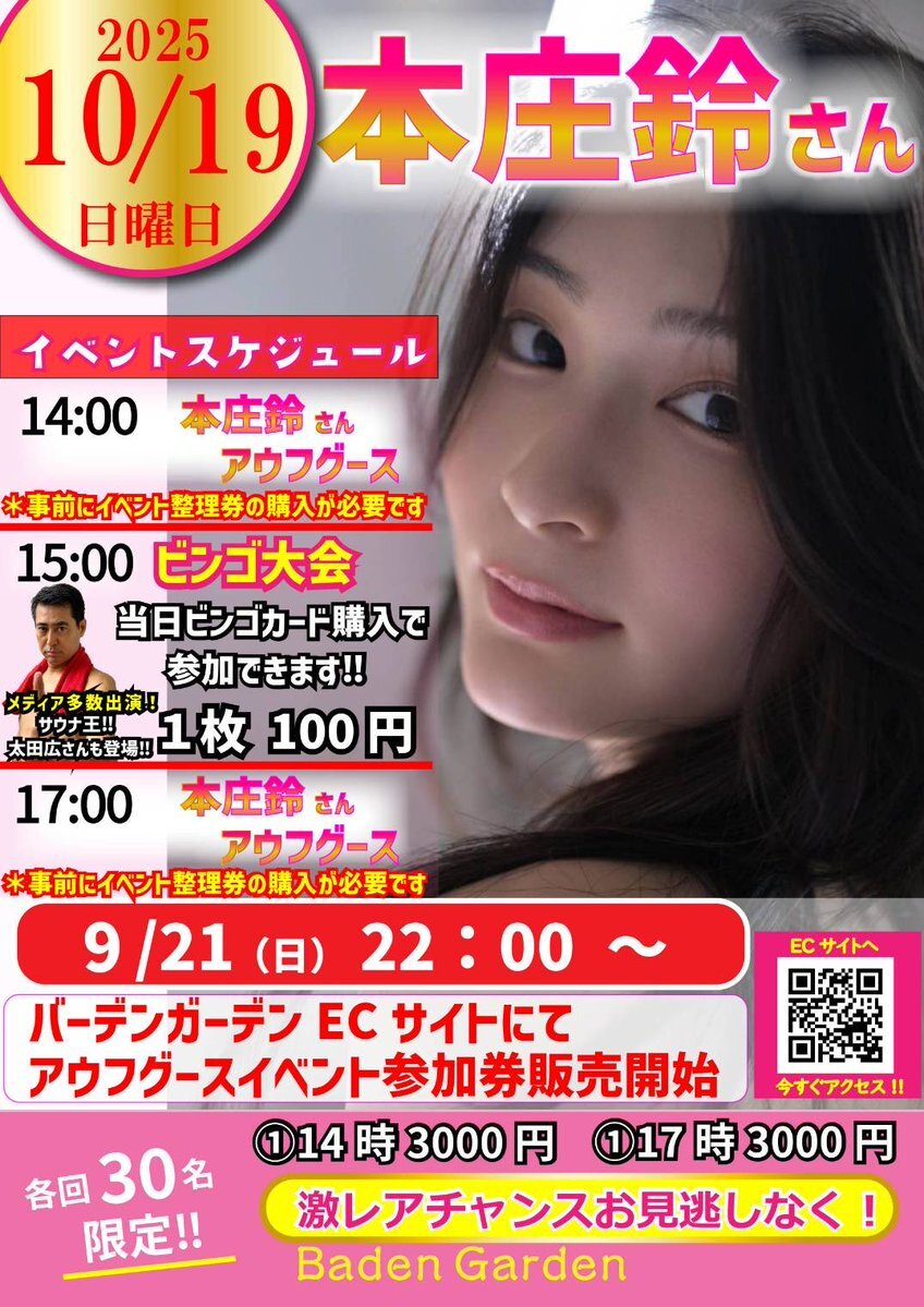 🧖🏻♀️🤴🏻【本日です❗️💡】 10/19(日) 本庄鈴さん🧖🏻♀️来店イベント🙋🏻♀️ @ バーデンガーデン(所沢) 様 14:00〜 鈴さんアウフグース🌿(※参加券完売御礼🙇🏻♀️) 15:00〜 ビンゴ大会🎱(※ビンゴカード(100円/枚)購入でどなたでも参加できます🙆🏻♀️) 17:00〜 鈴さんアウフグース🌿(※参加券完売御礼🙇🏻♀️) pic.x.com/9f23koB3c0