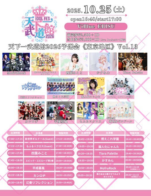🐾本日のシュウカイ🐾 天下一武道館2026予選会Vol.13 日程:10/25(土) 場所:ViBlue EBISU 開場:16:40/17:00 料金:前売¥2,500/当日¥3,000(各1D) 🎤19:50-20:05 📸20:25-21:15(終演後ホール) 当日10:00まで 🎟️t.livepocket.jp/e/mtj2g 《10秒動画+1pt》 #天下一武道館 #モフルロックシュウカイ情報
