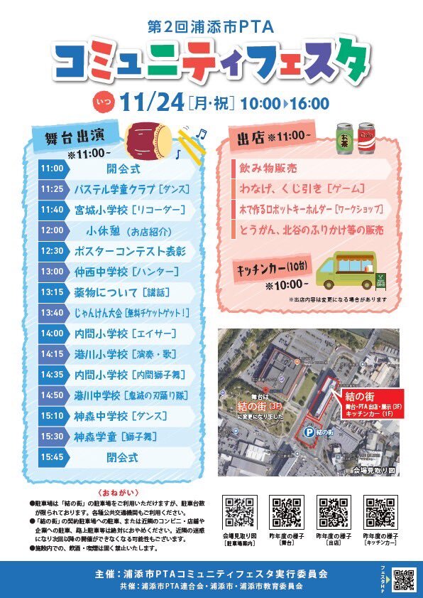 11/24(月・祝)10:00~16:00に、浦添市産業振興センター結の街3階大研修室にて、第2回浦添市PTAコミュニティフェスタが開催されます。多彩なステージパフォーマンスをお楽しみいただけます。さらに、人気のキッチンカーも出店予定家族みんなで楽しい時間を過ごしましょう。 urasoenavi.jp/event/20251117…