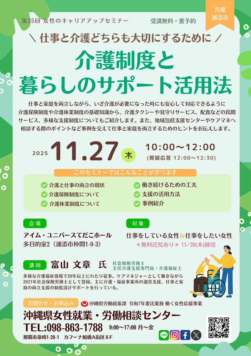 11/27(木)浦添市開催セミナーまだ空いてます! 主任介護専門員として現場で働く専門家から、介護と仕事の両立のポイントや介護休業等の制度について分かりやすくお伝えします。 ご予約☎098-863-1788 pic.x.com/4VCtWkESzp