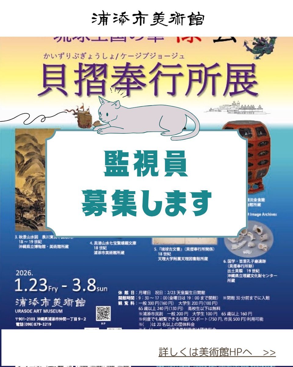 📢美術館監視員募集 浦添市美術館35周年特別展 展覧会運営と作品保護のお仕事 勤務: 2026/1/23-3/8 シフト制 時間: 9:00-13:00 or 13:00-17:00 12月研修あり・初心者OK 履歴書を美術館へ直接提出 締切:11月30日(日) 詳しくは👉urasoe-artmuseum.jp/2025/10/30/rec… #浦添市美術館 #求人 #沖縄 pic.x.com/M9sKPy2ZCp
