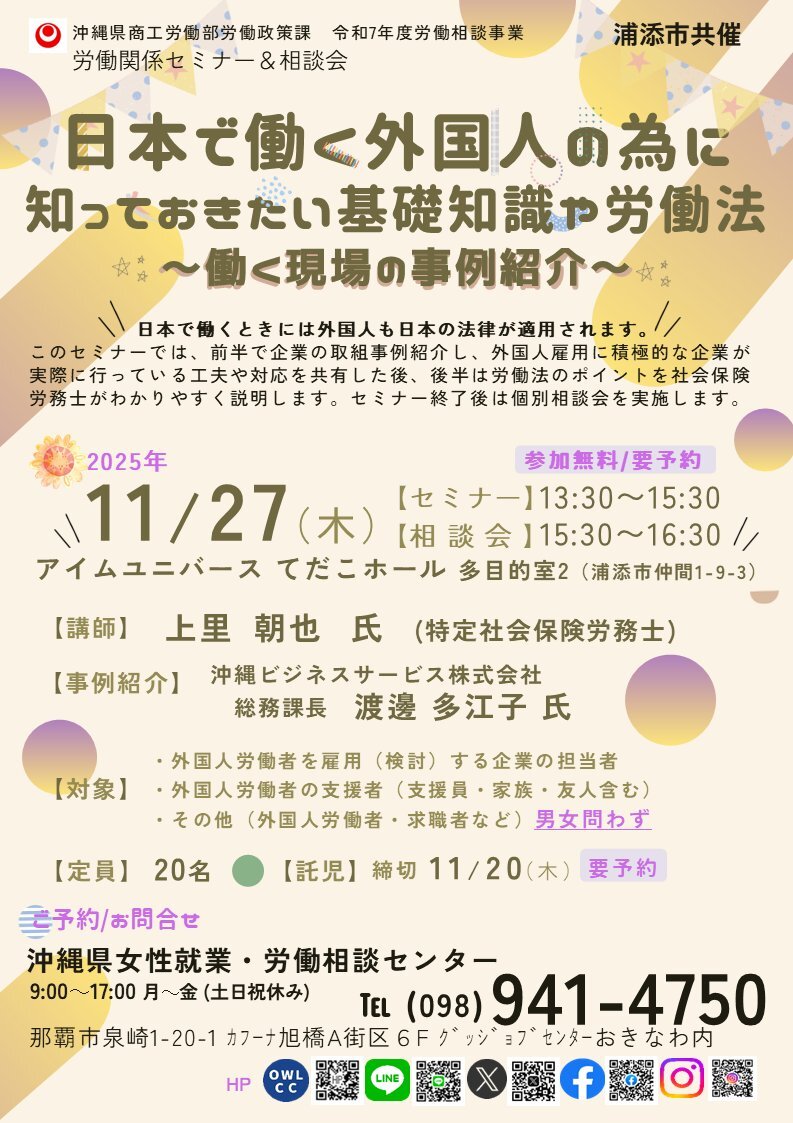 11/27(木)浦添市開催セミナーまだ空いてます! 外国人を雇用している企業の事例と社労士から、現場での工夫や外国人を雇用する際に知っておきたい労働法のポイントなどを分かりやすくお伝えします。 ご予約☎098-941-4750 pic.x.com/ozgffKIe9O