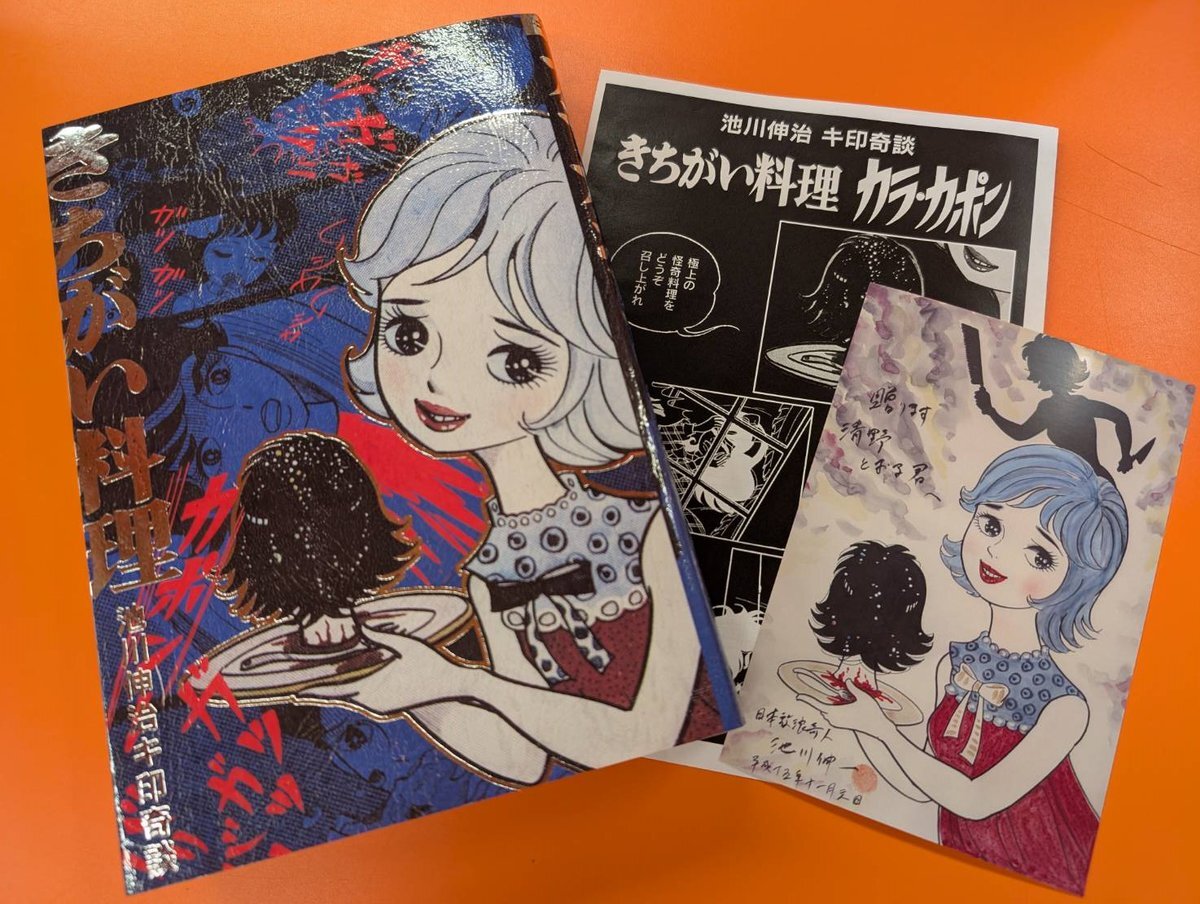 ぎりぎり前日!大まん祭1日目情報! 復刻・池川伸治「きちがい料理」には! 池川作品をリストでおさらいするペーパーと、さらに! 池川先生が2003年に描きおろし、漫画家清野とおる先生に贈った「きちがい料理」単行本表紙のリライト版イラスト図版をつかったポストカードが付属です!お見逃しなく! pic.x.com/4TRccj3n2W