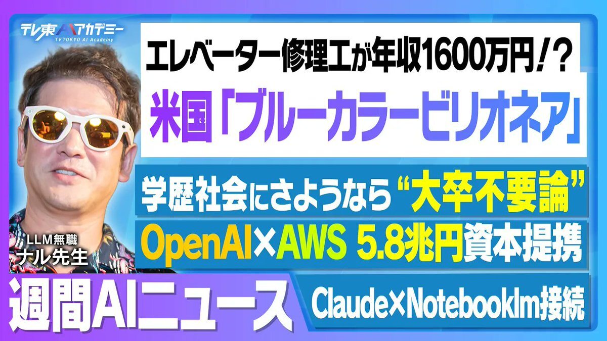【今週公開の動画を紹介💡】 ✅[週間AIニュース]米国ブルーカラー長現象、Sora有料化やOpenAIとAWS提携など最新情報をキャッチアップ! ✅[対談企画]三四郎・小宮さんとAI漫画家・野火城さん対談! ✅[バラエティ]リュウジさんがAI考案「世界一うまい丼」を実食検証! #テレ東AIアカデミー pic.x.com/3VOq9Kgzjj