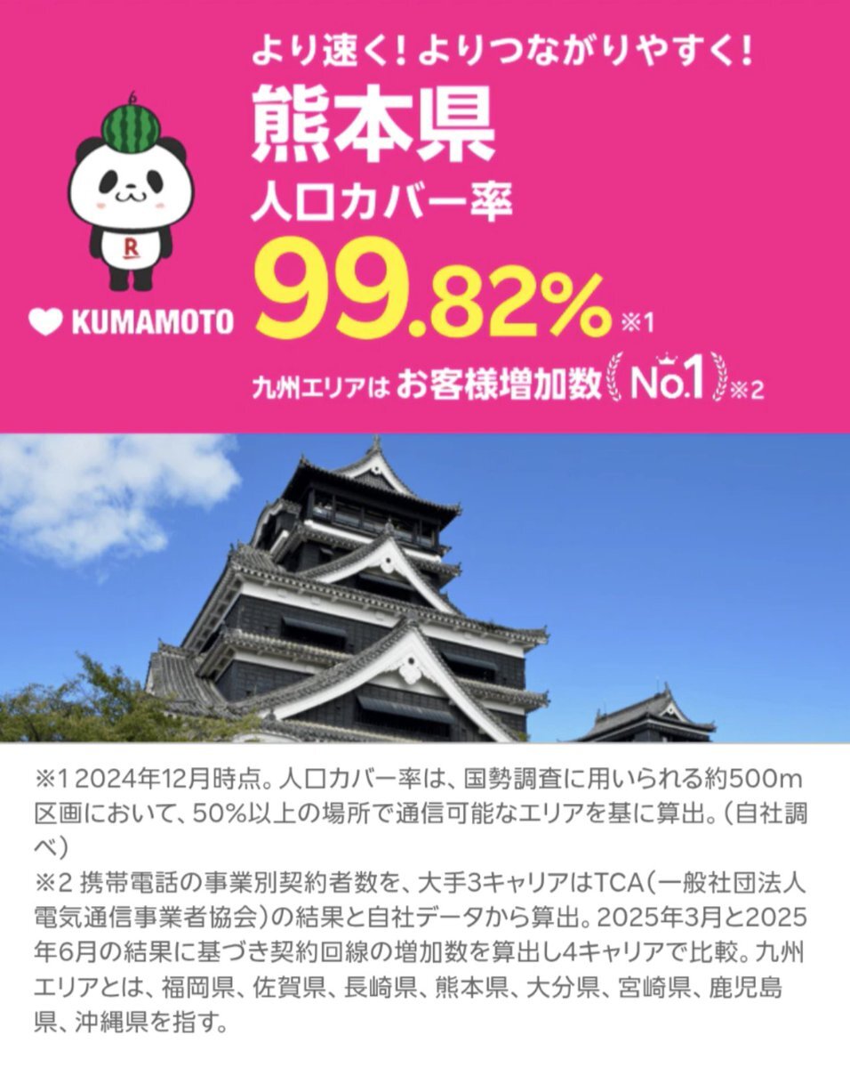 楽天モバイルのつながるエリア・電波拡大中✨ 熊本県:人口カバー率 99.82% 今なら紹介キャンペーン実施中! 乗り換え14000pt/新規11000pt! 店舗契約OK🙌 URLからログインするだけでエントリー完了👇 r10.to/hNQk7N #楽天モバイル #楽天ポイント #熊本県 #熊本 #くまモン pic.x.com/7m4Lcl6bze