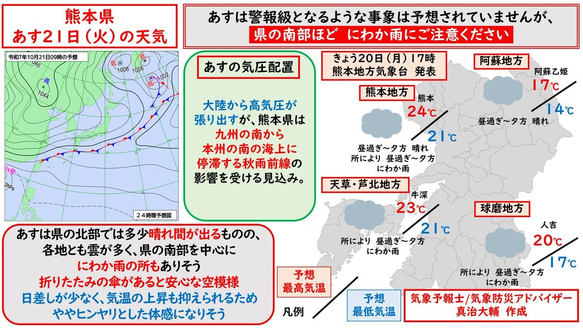 熊本県 あすの天気】 あす21日の熊本県は 北部では多少晴れ間が出ますが、 秋雨前線の影響で雲が広がる見込み 県の南部を中心に にわか雨の所もありそう 折りたたみの傘があると安心な空模様 最高気温は25℃に届かず ひんやりとした体感に 服装にはご注意を pic.x.com/UVYq4FVEhj
