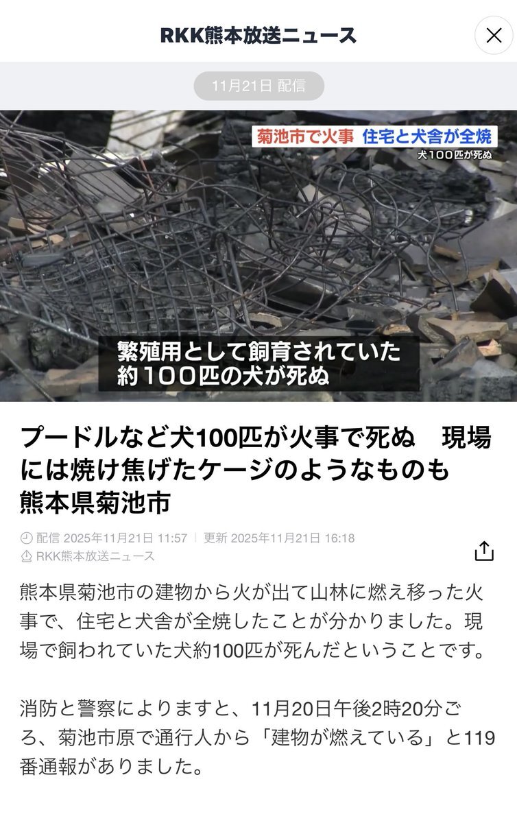 繁殖用というだけでも不憫なのにこれはいたたまれない プードル、ハスキー犬など100匹が火事で死ぬ 現場には焼け焦げたケージのようなものも 住宅1棟と犬舎2棟全焼 熊本県菊池市(RKK熊本放送) #Yahooニュース news.yahoo.co.jp/articles/ccfe5…