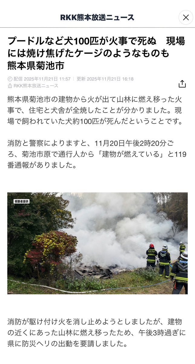 熊本の菊池市で、ハスキーやプードルが100匹も命を失った悲しい火災が発生。住宅や犬舎が全焼したとのこと。動物たちの無事を祈るとともに、飼い主や関係者の方々に心からのお悔やみを申し上げます。犬たちの思い出を大切に。🐾💔 tku.co.jp/news/?news_id=…