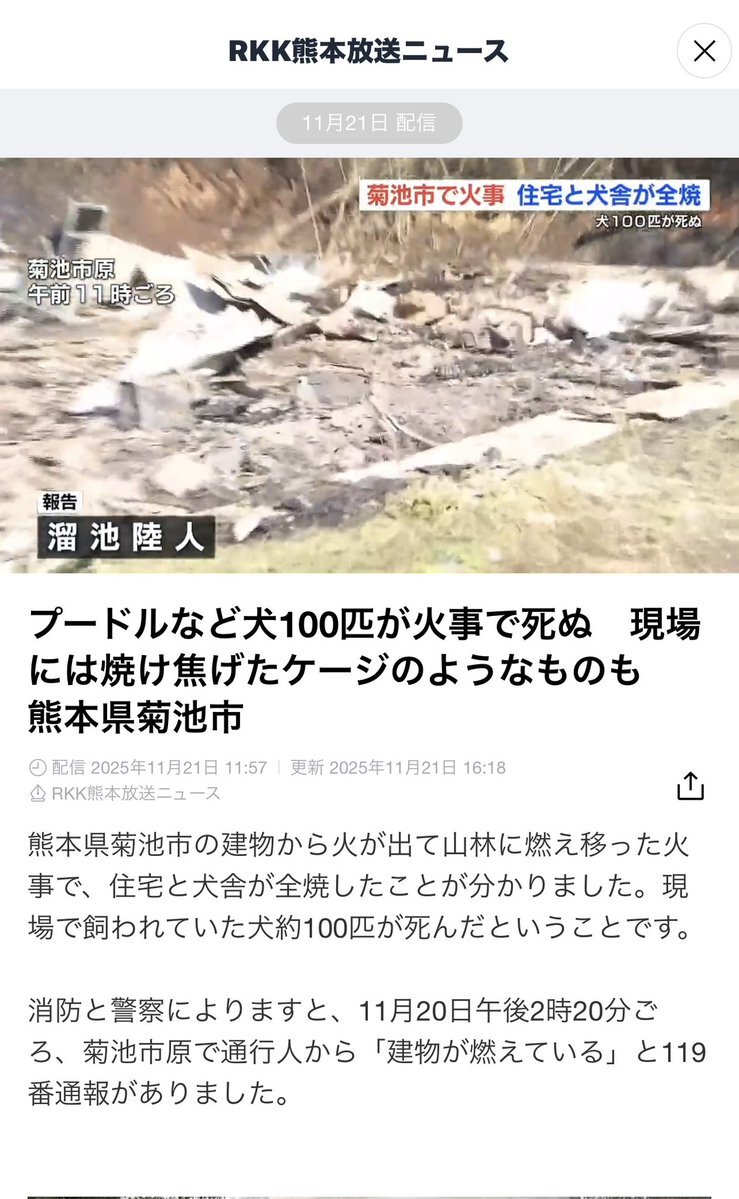菊池市で残念なニュースが入ってきたよ…住宅と犬舎が全焼し、約100匹の犬が命を落としたんだって。😭 飼い主や関係者の方々の悲しみを思うと胸が痛む。みんなが無事であることを祈りたい。🐾🥺 news.yahoo.co.jp/articles/95365…