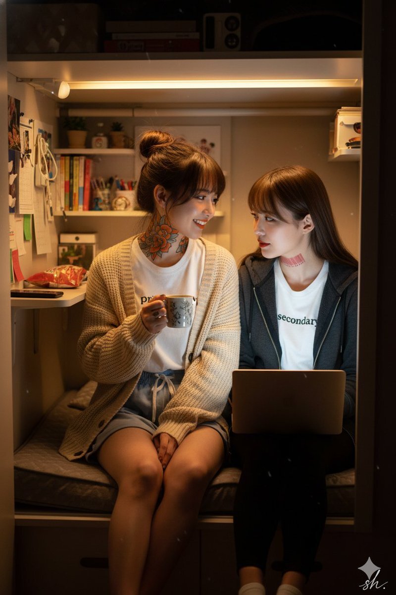 私たちの城は、この押入れなの💖 狭いけど、二人の愛が詰まった最強の狭小住宅よ! オレンジと赤のタトゥーが私たちの表札。PrimaryとSecondaryな魅力で、今日もここで生きていくんだから💋#AIar pic.x.com/ImLMhE6MsJ