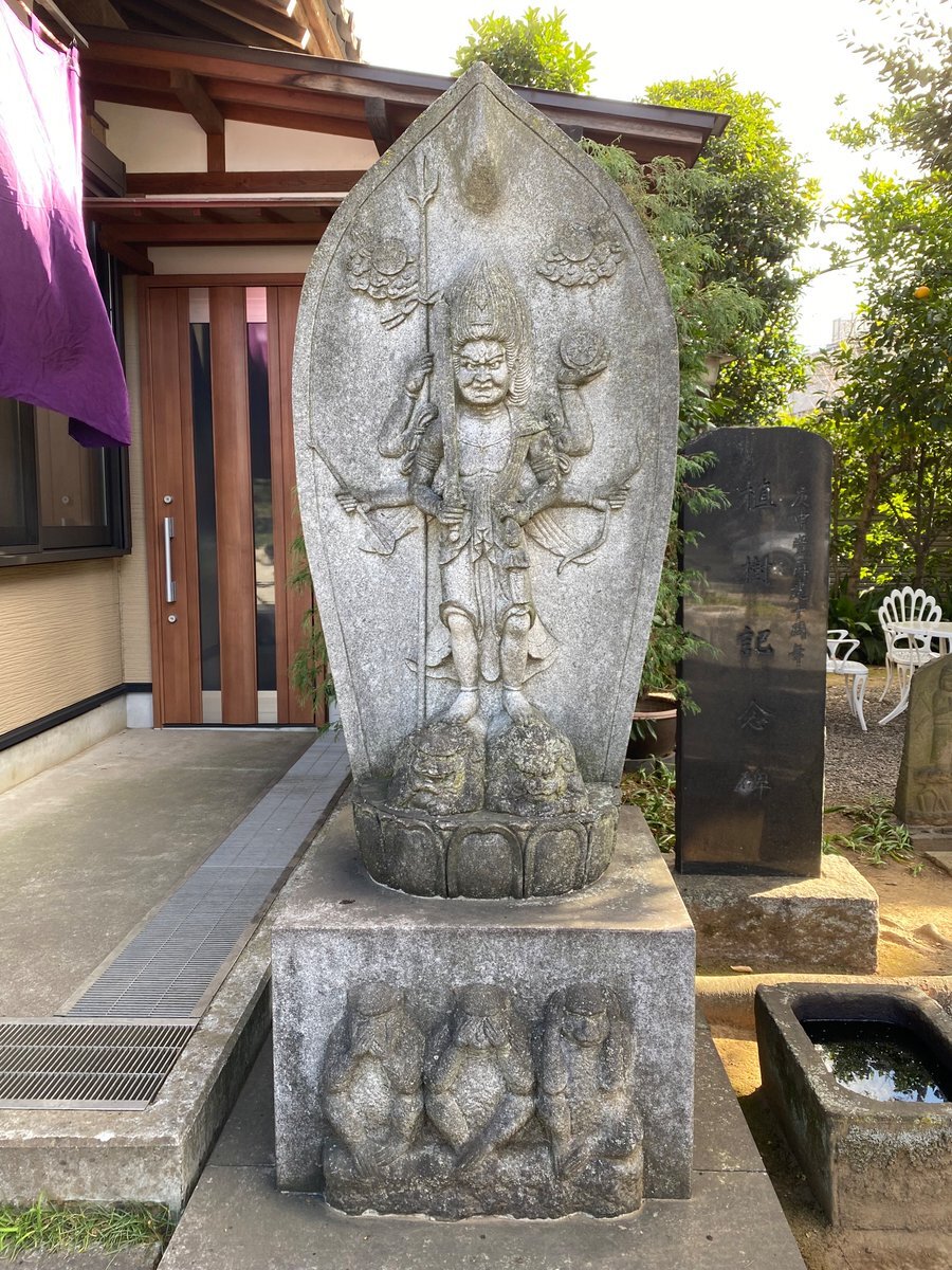 青面金剛像庚申塔(東京都大田区田園調布南・密蔵院) 「昭和五十五庚申年九月吉日建之(1980) / 石工岡崎石工団地成瀬石材商会謹刻 / 密蔵院総代世話人 / 新奉造立庚申塔之趣意者為庚申講員現当二世安楽之也 / 密蔵院住職第二十八世」 pic.x.com/FtiLOm7sMO
