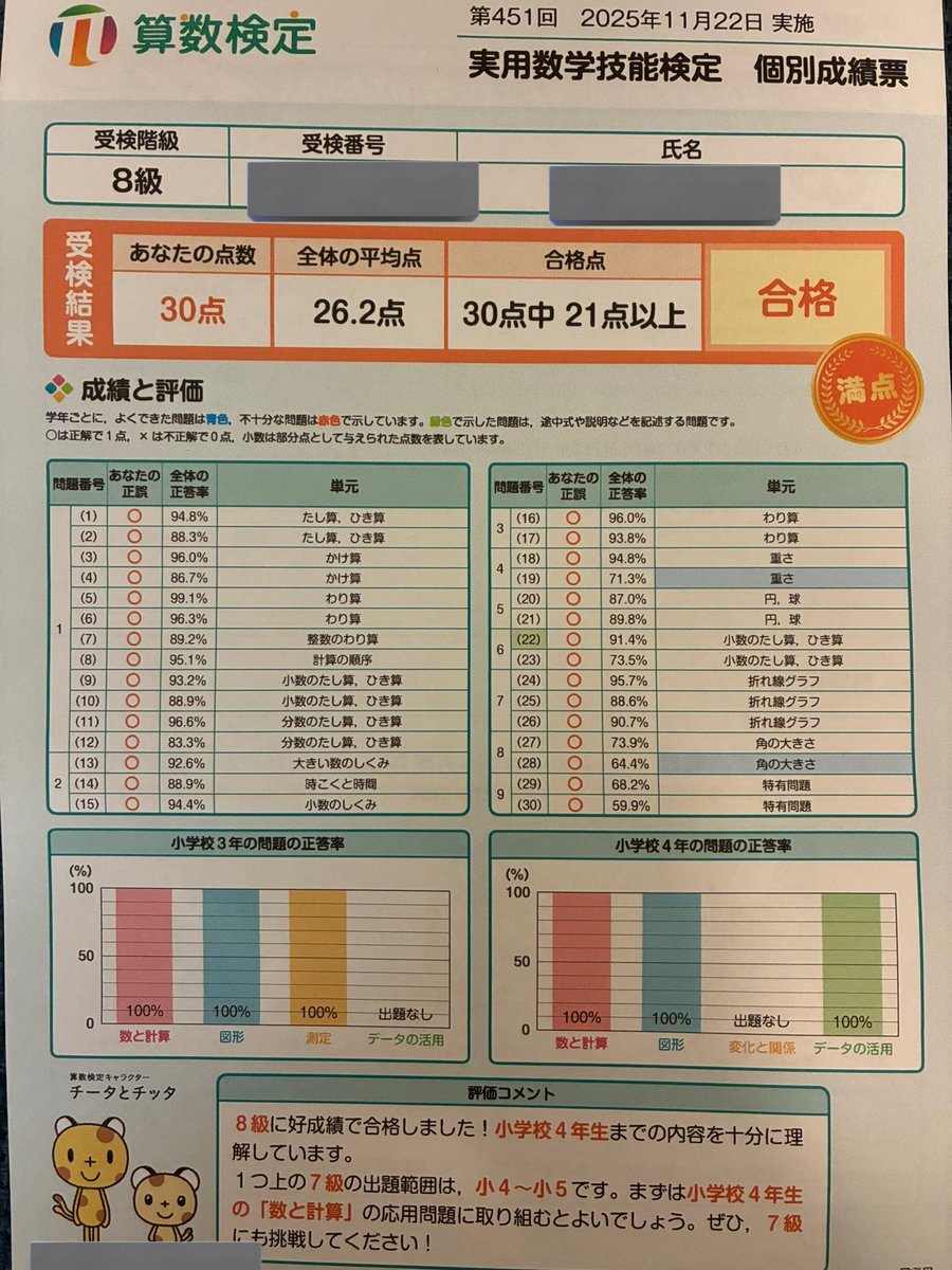 育成の結果、理科がいつもより点取れてた👏 国語は短歌得意みたい。漢字落とすな! 算数はいつも通り。 社会は私の「ここ出るよ!」をやっていったから、応用もよくできた。この前九段下の昭和館行った効果か!? 歴史の記述に苦手意識あり、理由付けて覚えていかないと。
