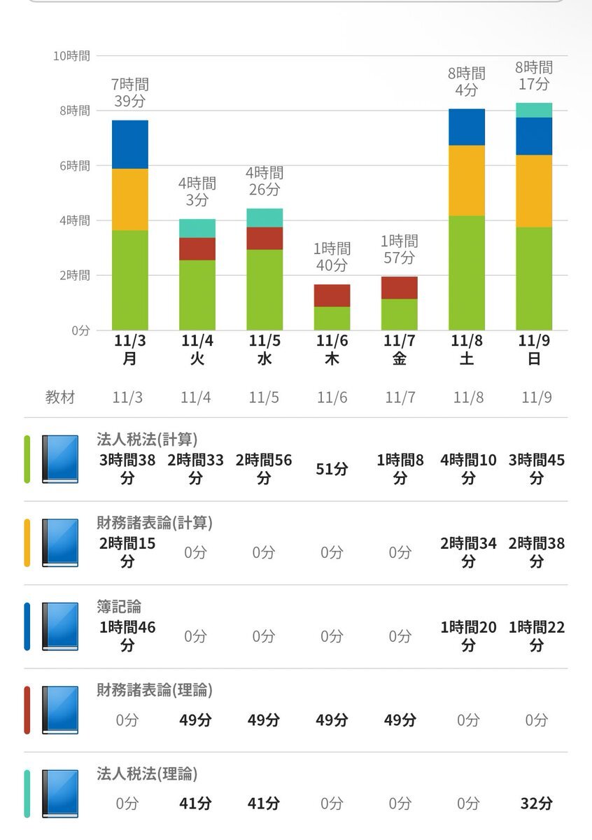 今日は財務諸表論と簿記論と法人税法 8時間17分。 今更知ったけど、法人税法って計算過程も採点対象なのか。 簿記論みたいに最後の数字を合わせる試験かと思ってたから、計算過程はめちゃくちゃに省略していた。 参考書通りに丁寧な導出をするように心がけなければ。 明日はもっと頑張りたい。 pic.x.com/uWdWwUJvVv