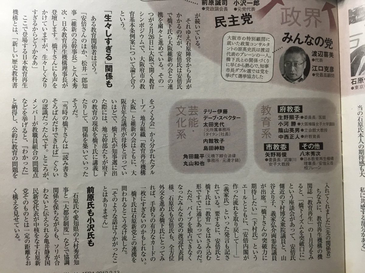 日本教育再生機構大阪の母体がJC大阪であるとの記事もある。この時は、大阪維新と教育再生機構が「双子の兄弟」との記述も。 なお、大阪維新の遠藤敬氏(衆議)は大阪JC出身で現役の教育再生機構大阪会長。 2012年2月13日AERAから