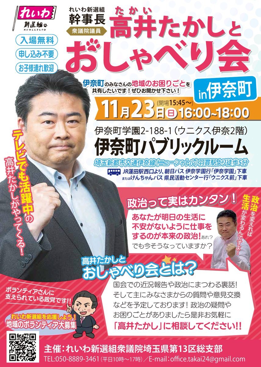 2025.11.23(日)16時〜 #れいわ新選組 #高井たかし とおしゃ会 in #伊奈町。 地元ネタも高井さんに質問して〜。 質問例) ・県立伊奈学園中で育鵬社の教科書が使われている件、 ・県民活動センターで高齢者向けに刈払機取扱や介護補助の講座が開かれているが、シルバー人材活用よりも年金UPすべき、等。 pic.x.com/5WKDXDS07J