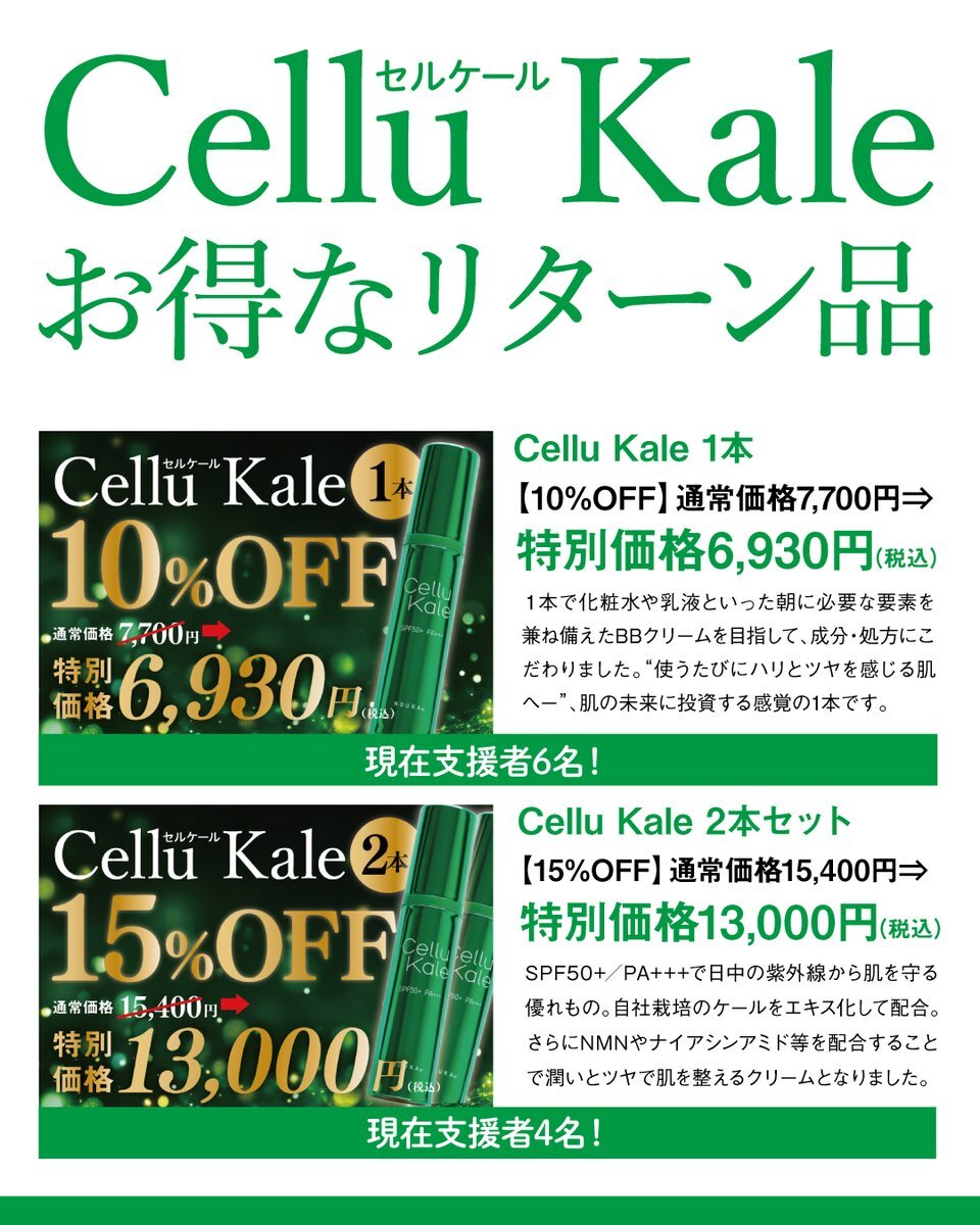 自社栽培ケールを配合した基礎化粧品 「Cellu Kale(セルケール)」クラファン中! 目標額100,000円を達成し、 現在183,580円のご支援をいただいております。 クラファンの期間は残り13日。 引き続きご支援・応援何卒よろしくお願いいたします。 今回はリターンのご紹介です! camp-fire.jp/projects/88696… pic.x.com/h8KDNbDB7W