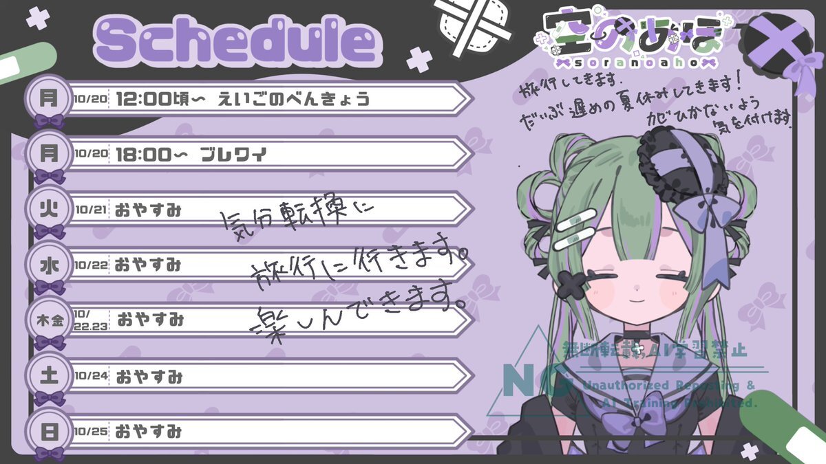 こんばんは〜🌙 空のあほです 10/20からのスケジュール🗓️です! 月曜のみ配信予定です! 少しだけ旅行して来ます✈️ 水曜日はお休みいただきますー! 月曜は英語のお勉強とブレワイです 今週もよろしくお願いします! #ahosched