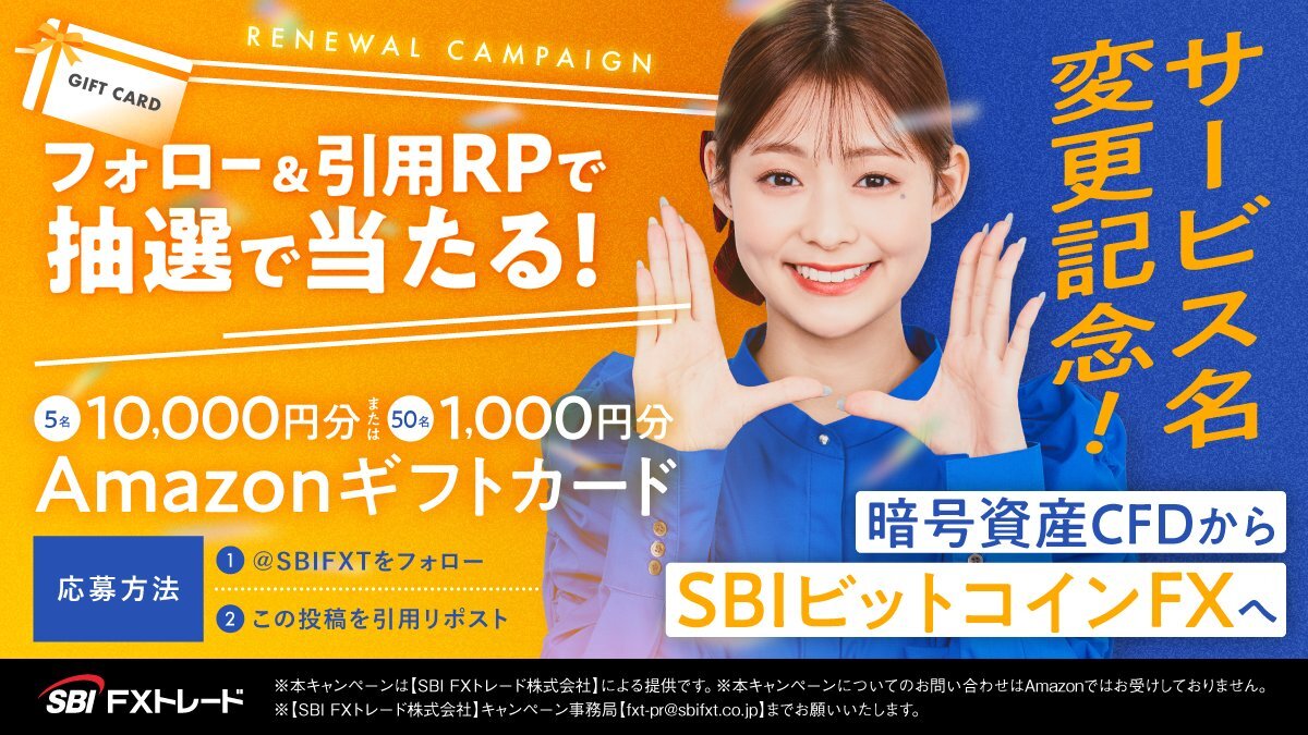 \フォロー&引用リポストで当たる🎯/ 【 SBIビットコインFX 名称変更記念キャンペーン】開催🎉 「暗号資産CFD」は「SBIビットコインFX」に名称変更しました✨ これを記念して、 抽選で55名様にAmazonギフトカードをプレゼント🎁 🎁賞品 Amazonギフトカード10,000円分×5名様 pic.x.com/2ckWFqmqhM