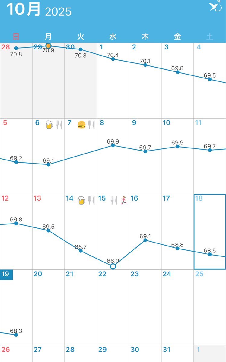 復帰24日目 10/19(日)朝68.3㌔体脂肪率19.9% #筋トレ 腕立100 腹筋100 プランク 朝 フルーツ、プロテイン、野菜スープ ちょっとずつ変化は出てるので積み重ね! 今日も仕事がんばろー #ダイエット記録 #ダイエット仲間募集中 pic.x.com/uvtVcsHbKT