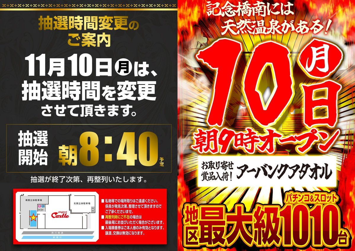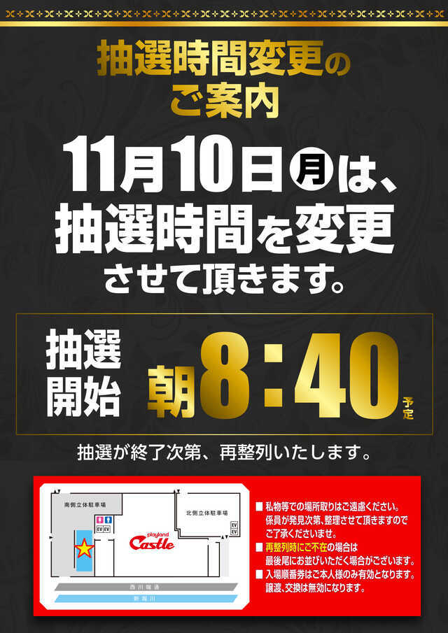 本日も 多数のお客様のご来店 ありがとうございます。 私、 プレイランド キャッスル記念橋南店 店長「ノダ」から 明日のご案内をいたします。 明日、 2025年 11月10日(月曜日)、 朝9時開店です。 ※抽選はいつもと違い、 8時40分からです! 「スロパチ来店取材匠」来店