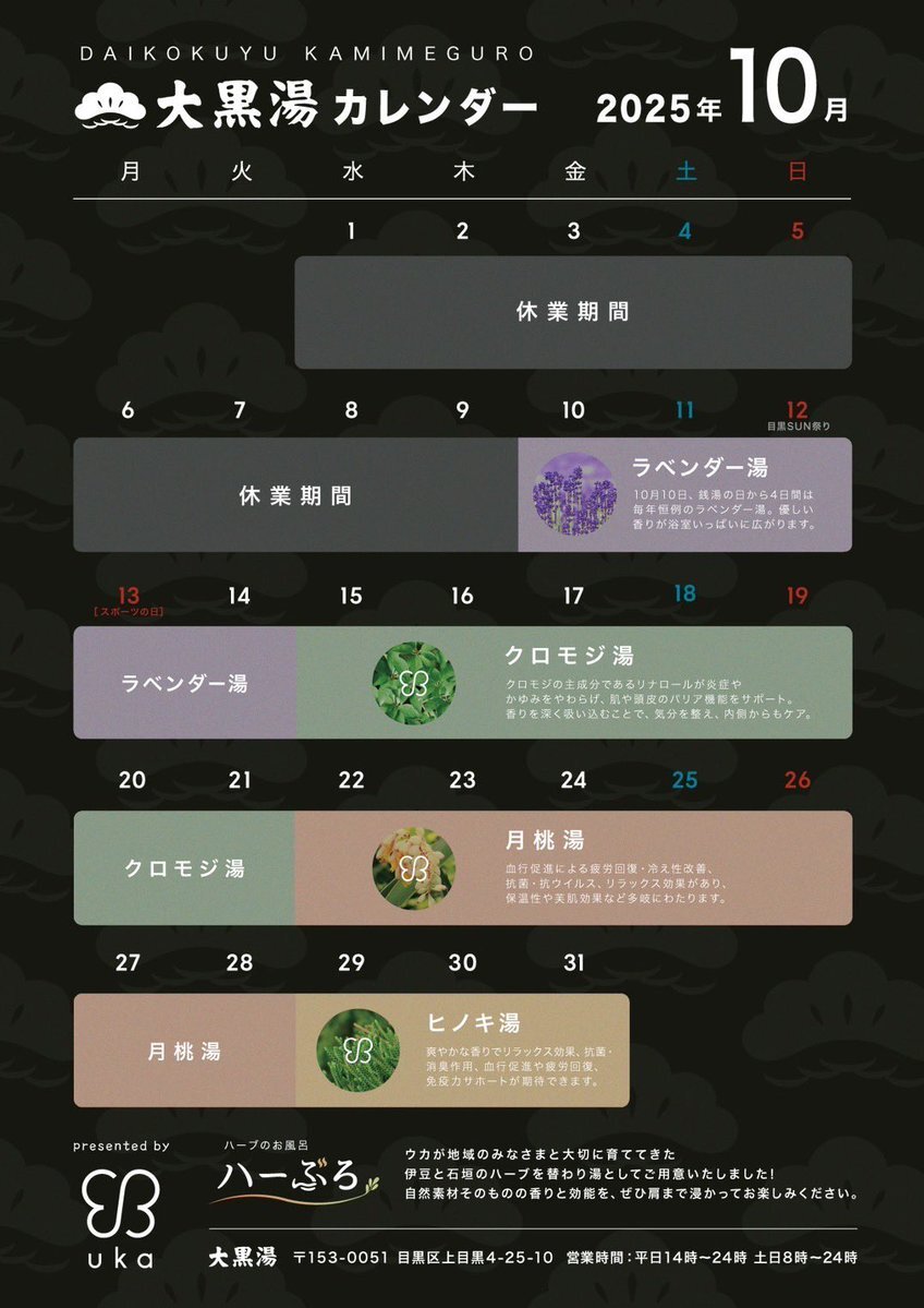 【10月の大黒湯カレンダー】 新しい大黒湯では、湯の質にこだわり、 季節ごとに「薬草の変わり湯」をご用意しています。 10月は、ラベンダーをはじめ ukaのクロモジ、月桃、ひのきをラインナップ。 それぞれの香りと効能をお楽しみいただけます。 #大黒湯 #上目黒 #銭湯