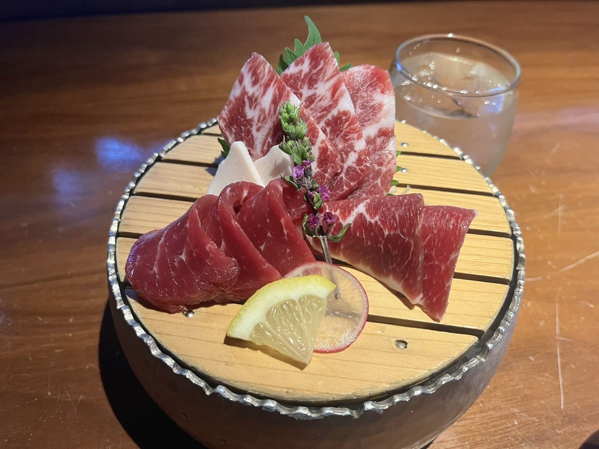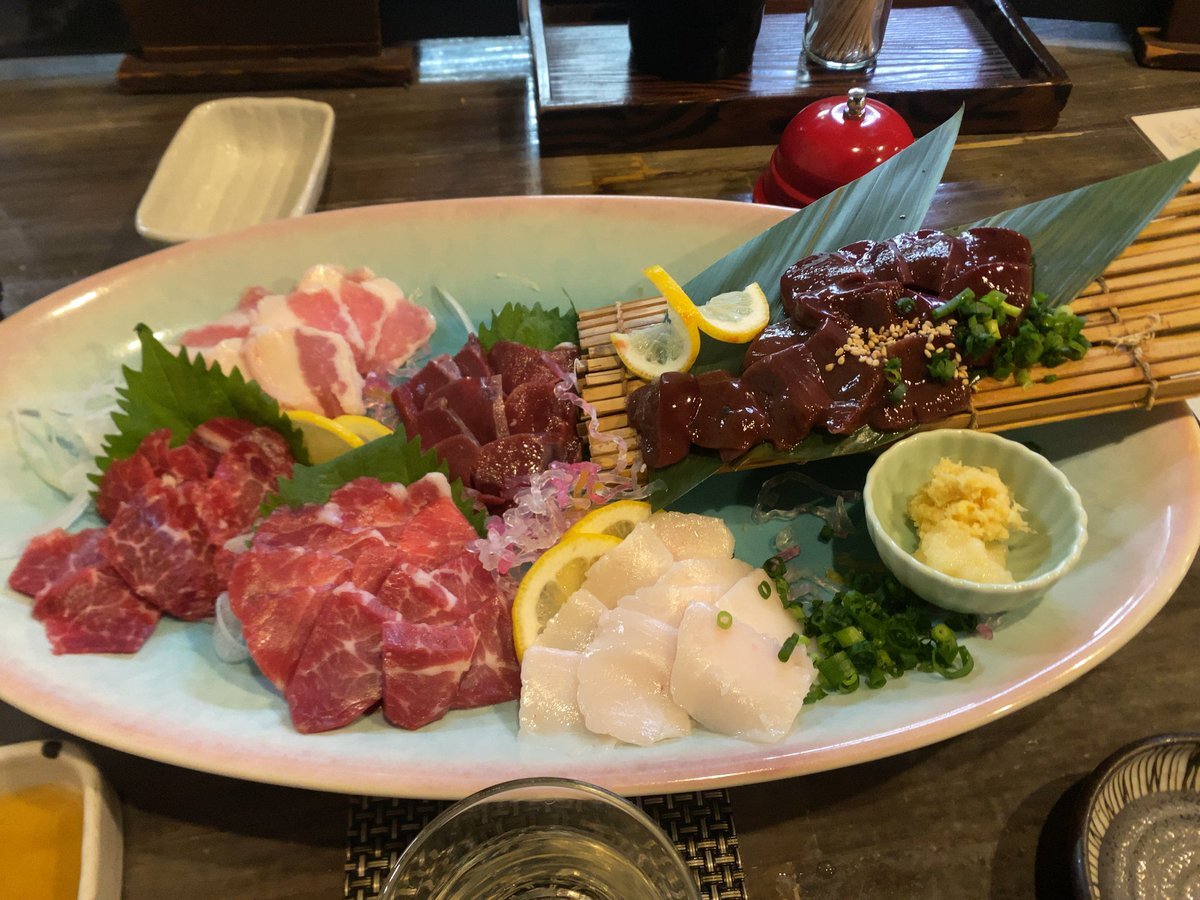 熊本に来たらこれ食っとけなやつ🐎 球磨焼酎の大石で贅沢なちょい呑み🍶 個人的に以前来た時に食べた馬レバー刺しがヤバいくらい美味いので毎回食べてる☺️ 写真には載せてないけどお酒が進みすぎて生中も頼んでしまった…笑 [花畑町停留場 馬桜 熊本下通り店 特上馬刺し盛合わせ他] pic.x.com/fm61VoFnDq