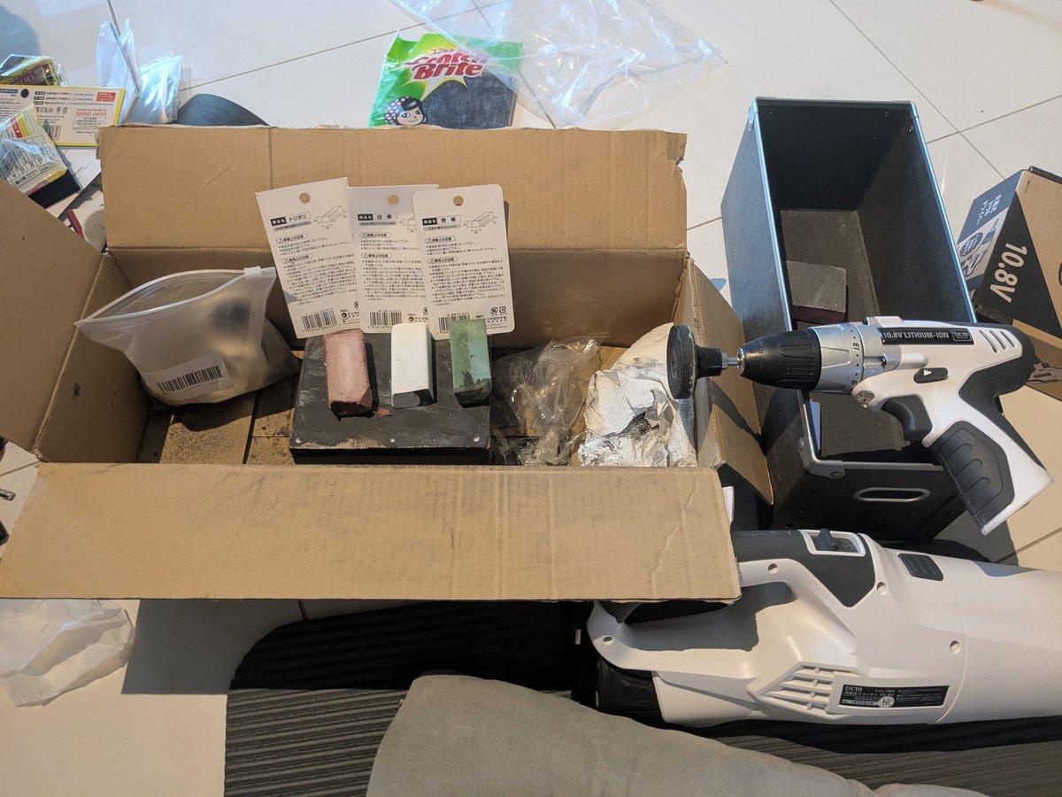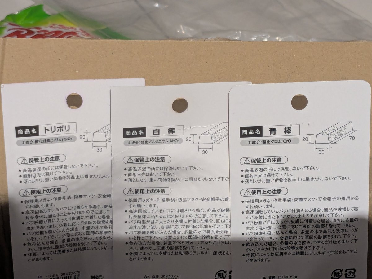 いろいろ届きましたので、包丁磨き再開。 赤棒(トリポリ)酸化ケイ素(シリカ) SiO2 白棒(酸化アルミニウム) Al2O3 青棒(酸化クロム) CrO  とあります。 ドリルに着けるフェルトパフなかなか便利。 熱は出ますので薄刃は止めておきます。 pic.x.com/jBpRQpt4Qy