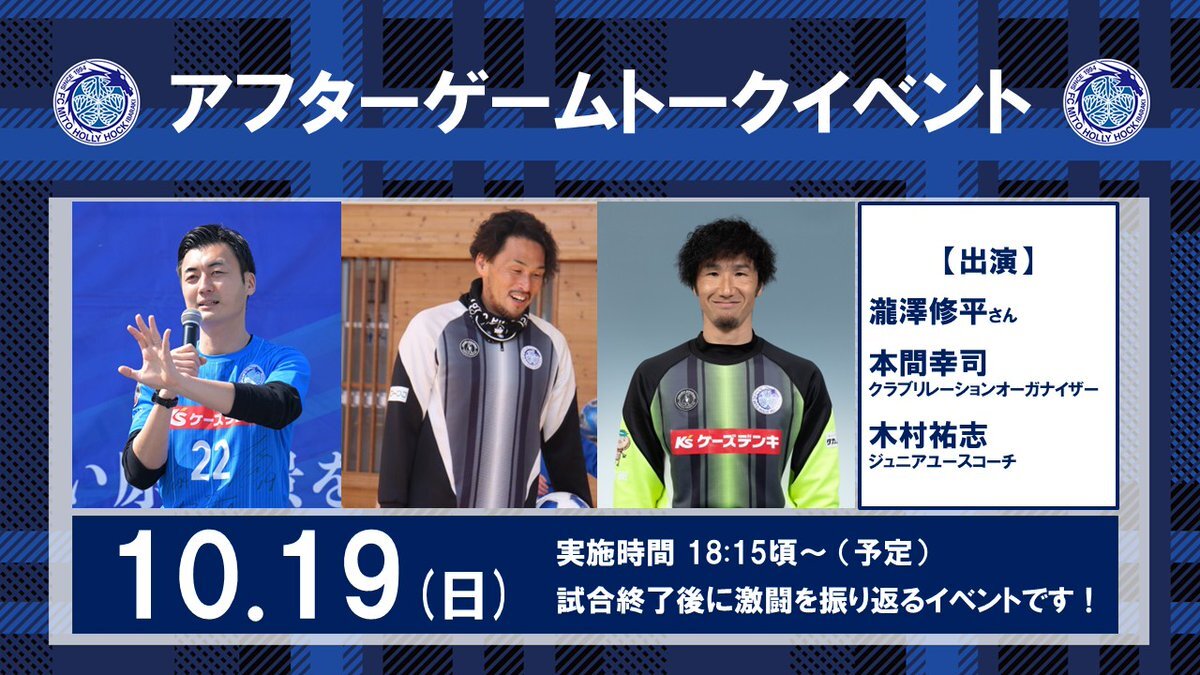 #1019千葉戦 試合終了後の余韻をスタジアムで🔥 「アフターゲームトークイベント」を開催します📢 ➡mito-hollyhock.net/news/p=46875/ #瀧澤修平 さん、#木村祐志 ジュニアユースコーチ、#本間幸司 CROと激闘を振り返ります。 スタグルの延長営業も決定🍴 試合終了後もスタジアムでお楽しみください❗️ pic.x.com/yUcWSvEdDr