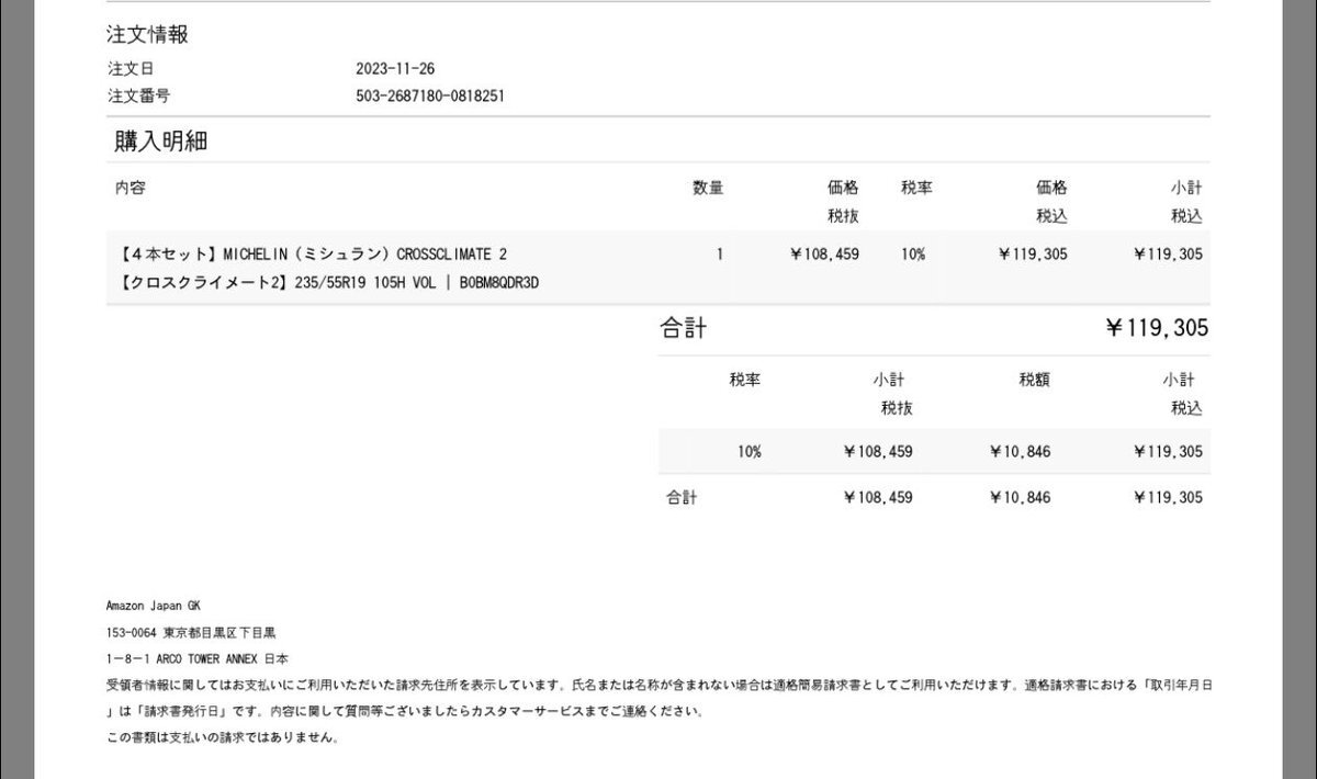 235/55R19のMichelin CROSS CLIMATE2 4本で12万円ほどでしたので、金額も普通です…。車やタイヤにもよるとは思いますが…。 pic.x.com/xhFJFA3n8w