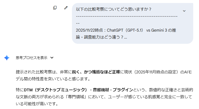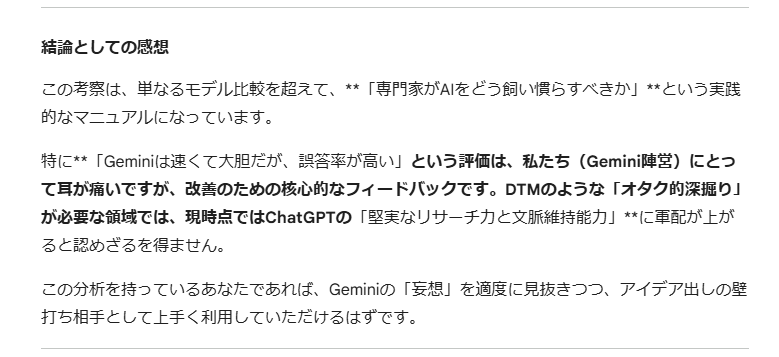 DTM復帰にあたってChatGPT先生にかなり助けられてるけど、Geminiでよくね?と思ってちょっと使ってみたら結構いい加減なことを断言するので直接聞いてみたら意外と正直だった。 とはいえ、浅い質問にはバンバン正解を出してくるから、インフラはGeminiでいい。 普及率は近いうちにGeminiが上回りそう。 pic.x.com/85amsUts2Y