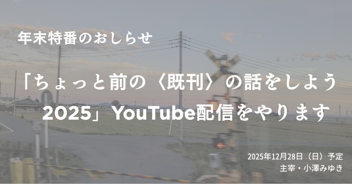 【年末にYouTube配信するにあたり、「ちょっと前に出た、良かった本」を募集します】🙌📚📨 「めっちゃよかった、でもちょっと前に出た既刊本」を語る配信イベントを、12/28(日)に予定しています。 ぜひ皆さんのおすすめを教えて下さい!(次の投稿に企画の説明や、細かいFAQのリンクあり) pic.x.com/CFw3XwCN7s