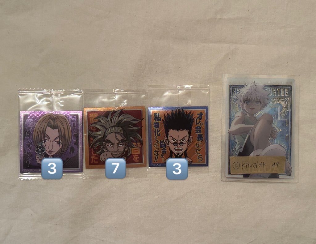 【交換】HUNTER × HUNTER ハンターハンター ウエハース 譲1.2枚目 求3.4枚目 写真に写ってないヒソカイルミ コムギ メルエム ナックル ゲンスルーも検討🉑です。 郵送希望です。 ※♡が付いているものは十二支ん含む取引を優先させて頂きます🙇♀️ pic.x.com/A7GiwCNp4m