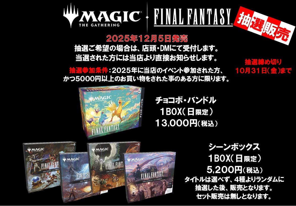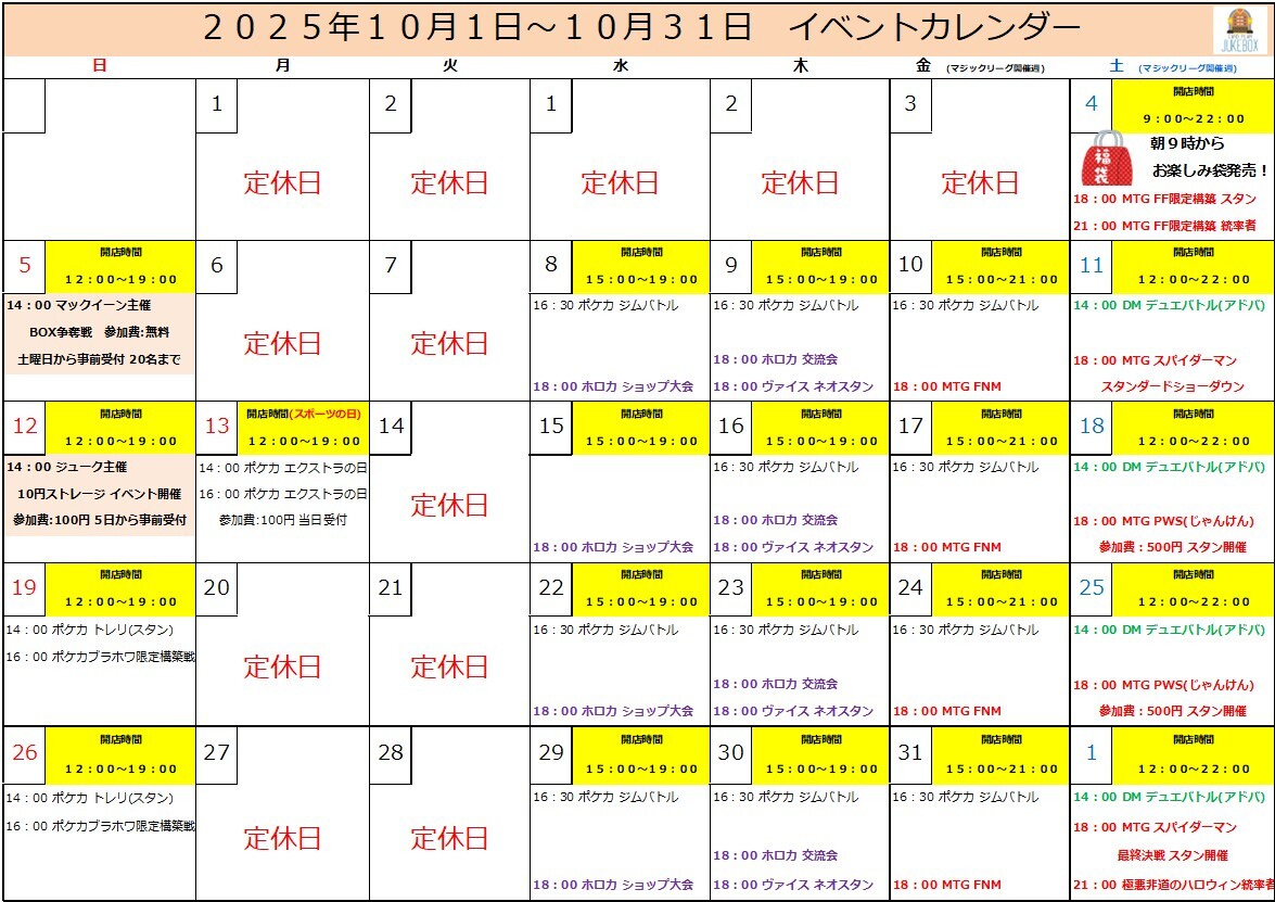 本日(10月15日)の大会は 18:00~ デュエマ ガチデュエバトル 18:00~ デジモン テイマーバトル 19:30~ MTG MINTCOMMADER(統率者) です!! ご来店お待ちしております。