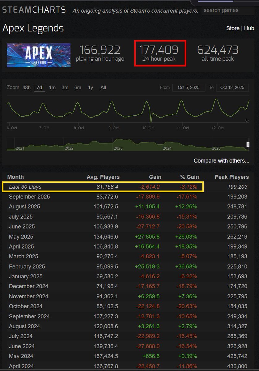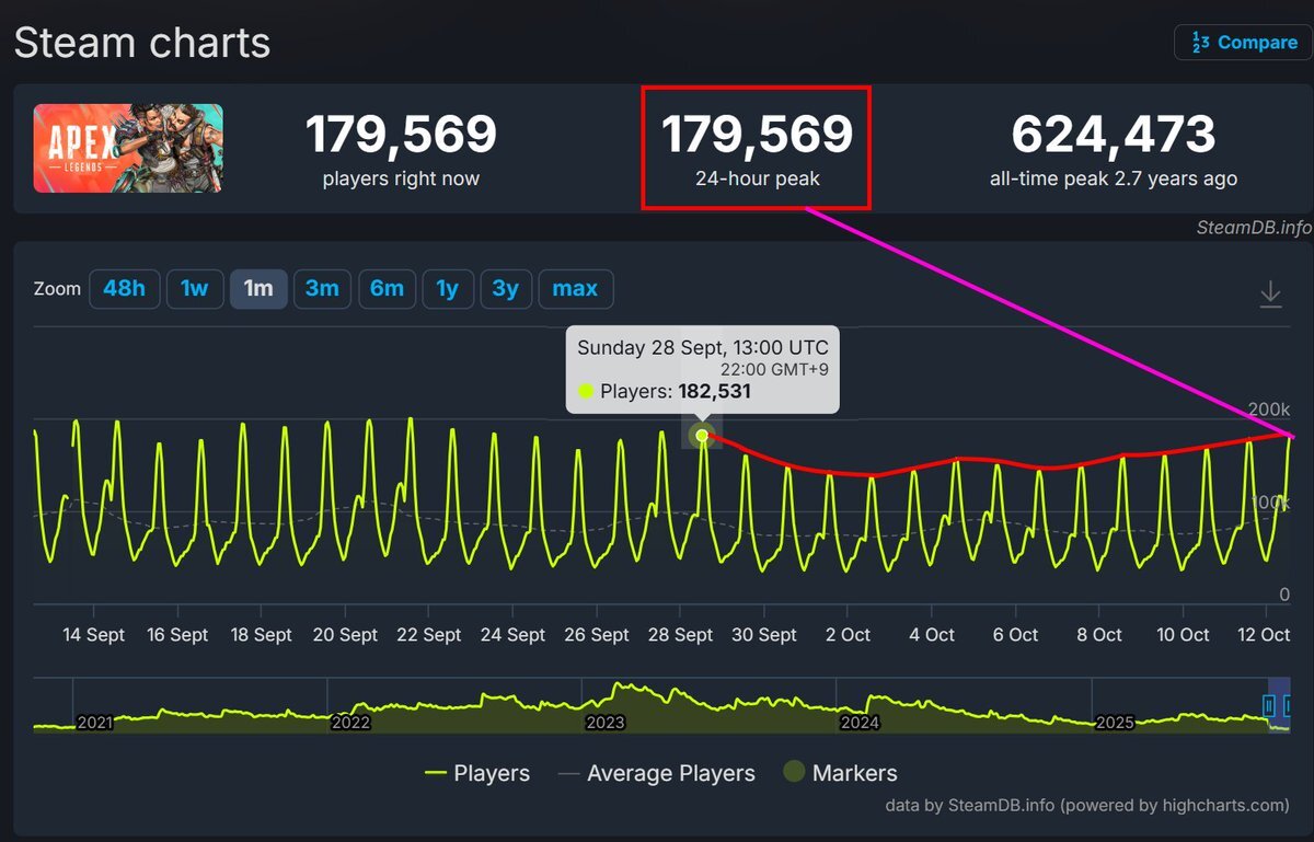 報告ぅ~ Steam版APEX 9月28日以降4万人前後減少していたがこの週末で少し戻って来た感じだなぁ🧐 ただ今後の動きに期待したいが平均プレイヤー数が81,158人と少ないのが気になるぅ~🤔 猛者配信も観たが敵が強い感じだなぁ🥺 音ない時もあるみたいだし😱 EA買収後の動きも運営から言って欲しいなぁ🤨 pic.x.com/ujnwJpKWj5