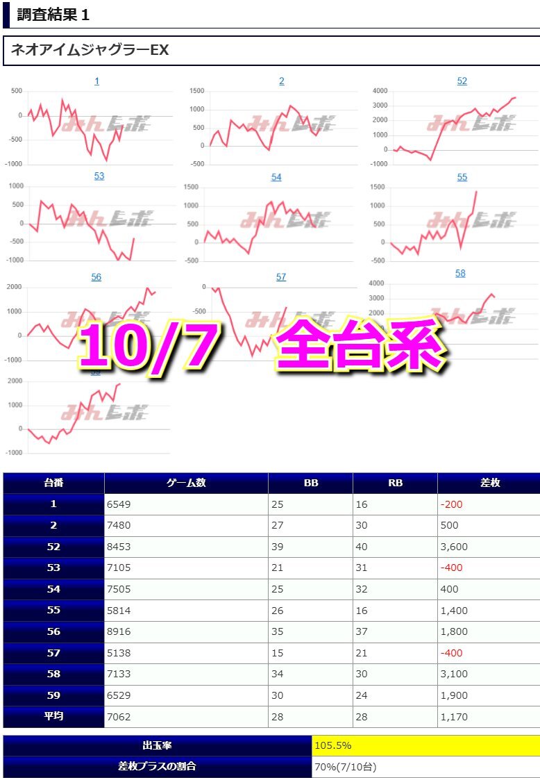 📝10/7 エスパス日拓溝の口駅前本館 🤩クロロ調査隊オールスターS結果🤩 ▶️抽選158人 🖊️全台系 ・ネオアイムジャグラー ┗平均+1,170枚 🖊️並び(4箇所12台) ┗平均+2,717枚 🖊️末尾「⑦」 ┗平均+500枚 全台系のネオアイムでは +3,600&+3,100枚や、+2,000枚に 迫る2台など計5台の4桁差枚を記録✨ pic.x.com/vya6CzVqlG x.com/bskkujira/stat…