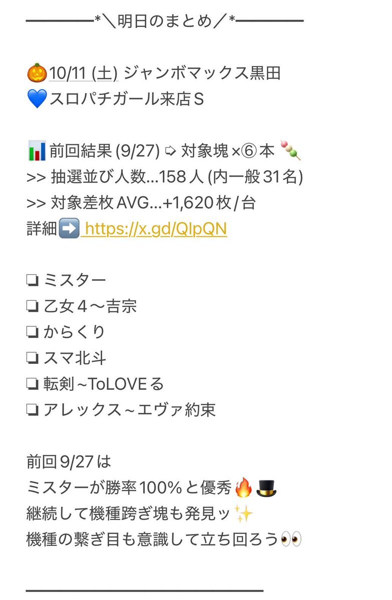 ━━━━*\明日のまとめ/*━━━━ 🎃10/11 (土) ジャンボマックス黒田 💙スロパチガール来店S 📊前回結果(9/27) ➭ 対象塊×⑥本 🍡 >> 抽選並び人数…158人(内一般31名) >> 対象差枚AVG…+1,620枚/台 詳細➡️ x.gd/QIpQN 詳細に関しては 下記画像からご確認くだちい🥹🙏🏻 pic.x.com/84urQU0sMf x.com/yuuuu_slot2/st…