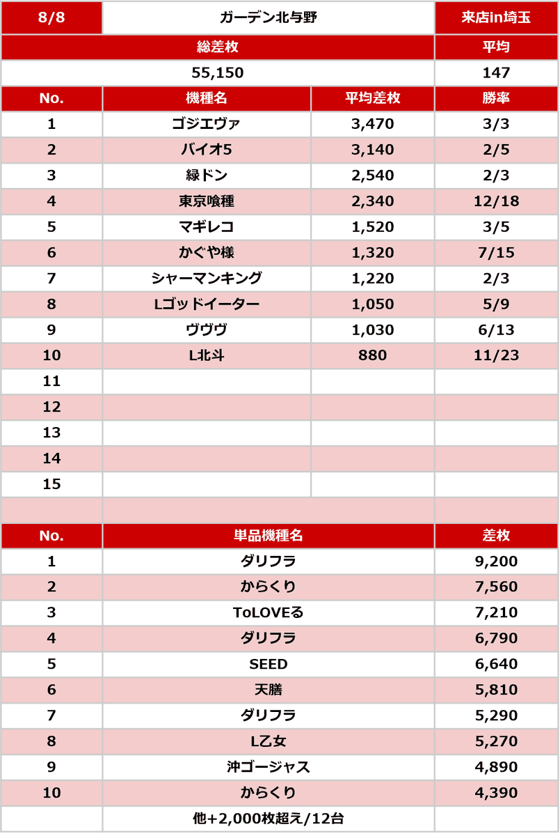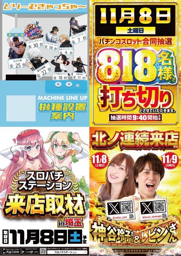 11/8 スロパチ来店in埼玉.攻略 ✅ガーデン北与野 8/8 全体Ttl+55,150枚/Av+147枚🔥 抽選243人 ✅ガーデン北戸田 🔥2連戦初日 10/28 全体Ttl+63,410枚/Av+129枚🔥 抽選252人 10/18 全体Ttl+63,900枚/Av+130枚🔥 抽選206人 pic.x.com/ivpa63qIv2 x.com/slotchousatai/…