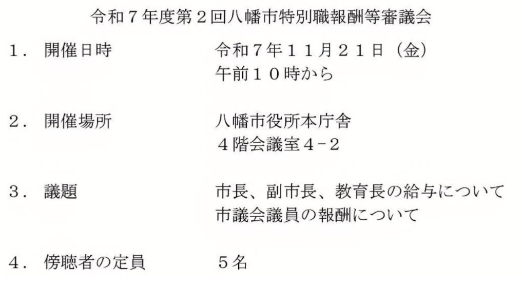 本日傍聴。人口は68,243人で外国人3,166人、2,030年で64,299人、2050年に48,950人になる。現在の議員定数、議員報酬は削減するべき。他市に比べて報酬が高額な理由は何か?八幡のみどんな特別な仕事があるのか?議員が報酬審議会に出席して高額な理由、過去2回も答申を無視した理由を説明してほしい。 pic.x.com/Fcdt28QK4o