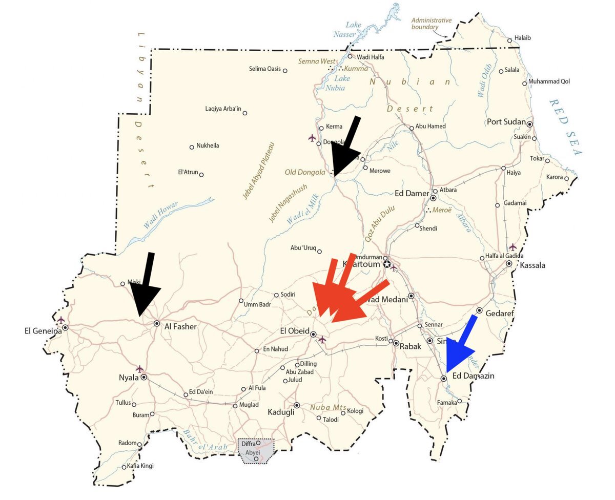 スーダン:北コルドファン州(赤)の複数地域で、軍とRSFの衝突が2日連続で続く。 RSFによるブルーナイル州ダマジン市(青)へのドローン攻撃。 スーダン医師ネットワークによれば、エルファシルから243人以上の妊婦が、北ダルフール州タウィラ及び北部州アルダバ(黒)の避難キャンプに到着。 続く x.com/BSonblast/stat…